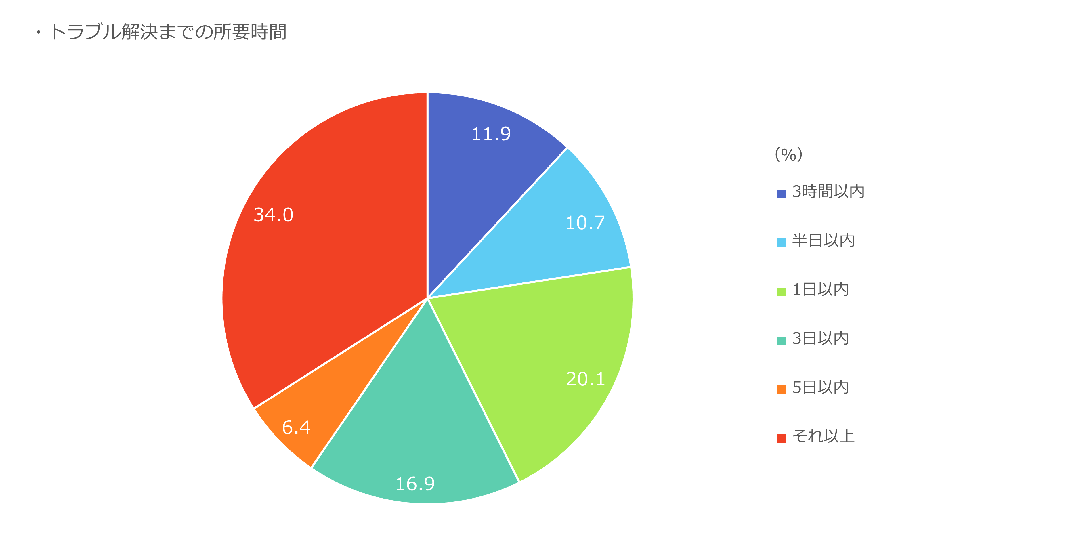 トラブル発生後、18.1%はサービス復旧の「時間に関係なく利用しない」と回答しています。サービス復旧まで10分以上を要した場合に利用をやめるとした回答者は24.1%に上り、3時間以上を要した場合のこの割合は54.3%に拡大します。「時間に関係なく利用しない」を合わせると、トラブル発生から3時間以上の経過で、実に7割以上が利用をやめていることになります。一方で、トラブル発生時に問い合わせをした際、解決までに要した時間で「3時間以内」と回答した割合は11.9%、「1日以内」と回答した割合でも半数に満たない42.7%でした。ユーザーが求める対応速度と実際の解決に要する時間に大きな乖離(かいり)があることが伺えます。