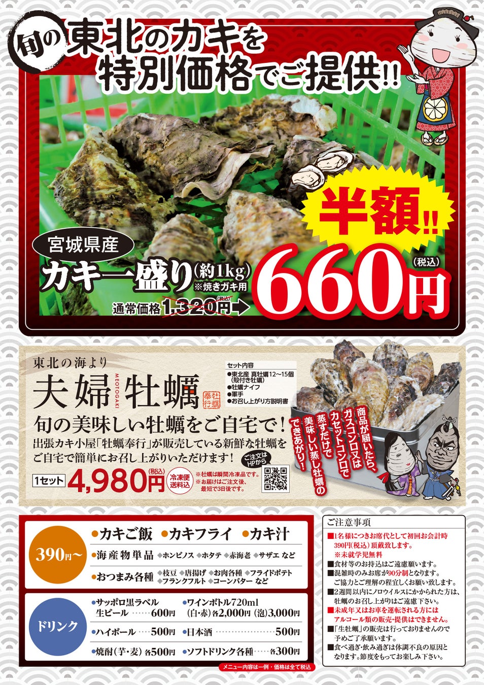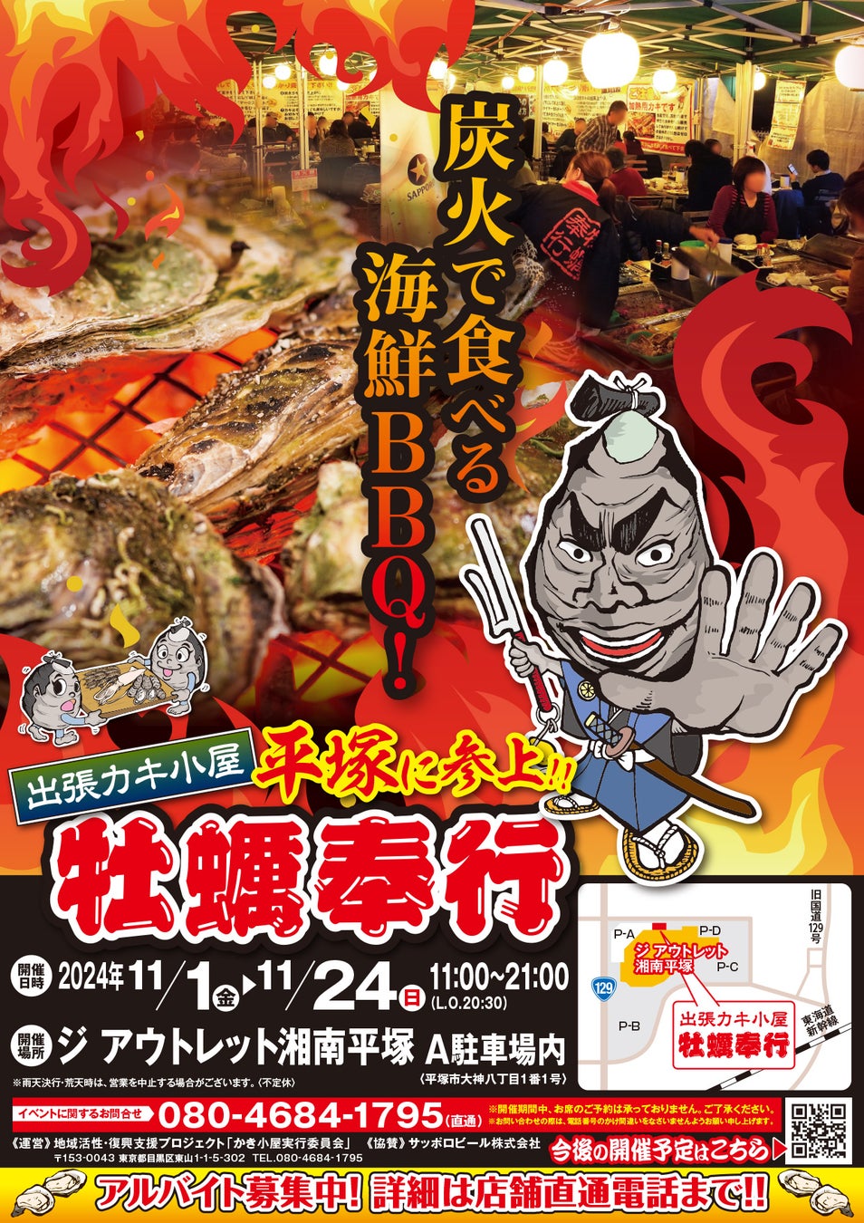 神奈川県平塚市 ▶︎東北の牡蠣が、復興支援価格の約1kg660円!! 11/1-11/24 の限定出店!炭火焼き出張カキ小屋「牡蠣奉行」