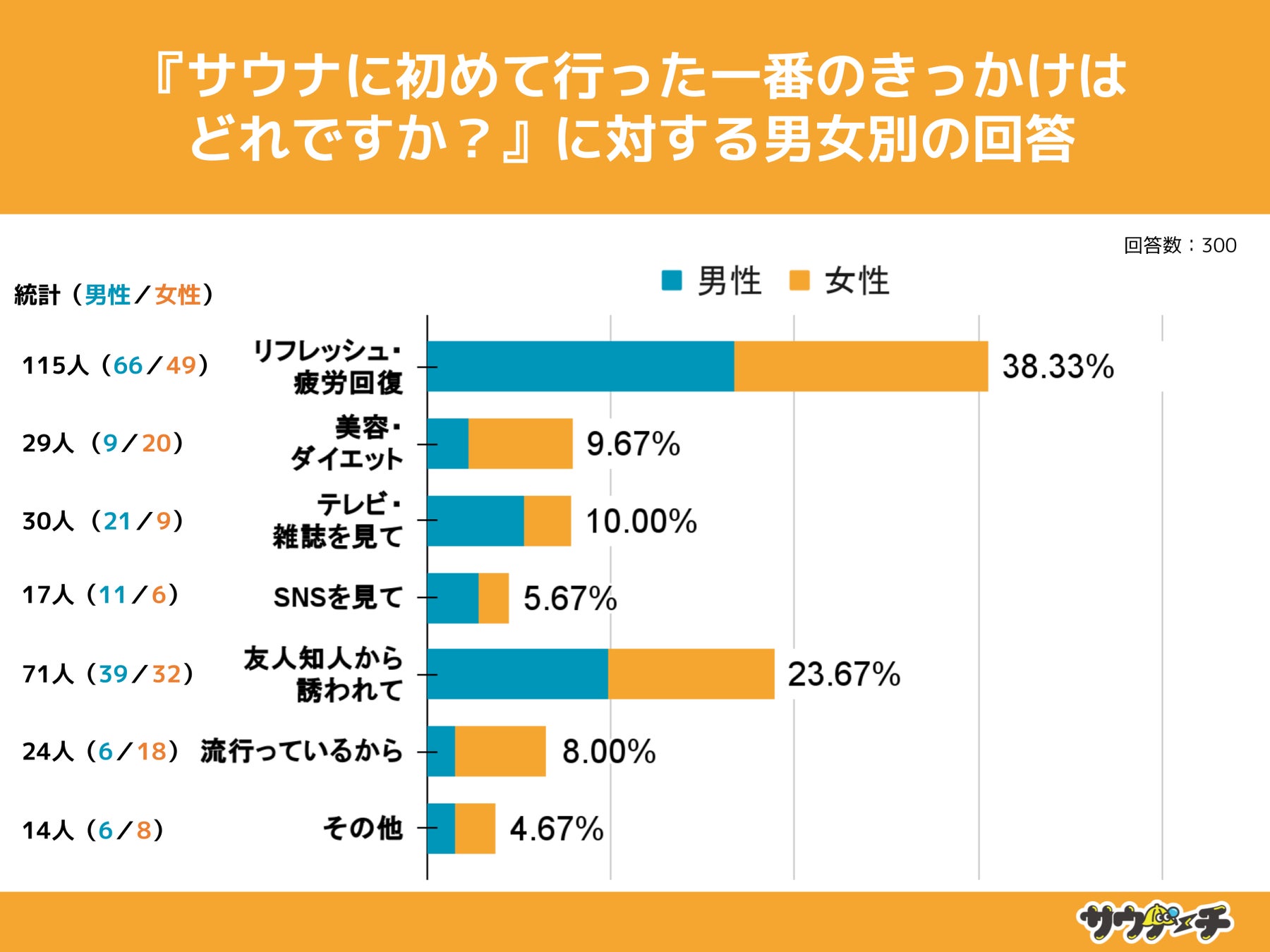 10〜30代男女を対象とした『サウナに初めて行った一番のきっかけはどれですか?』というアンケートで、最も多かった回答は「リフレッシュ・疲労回復」で約38%でした。
