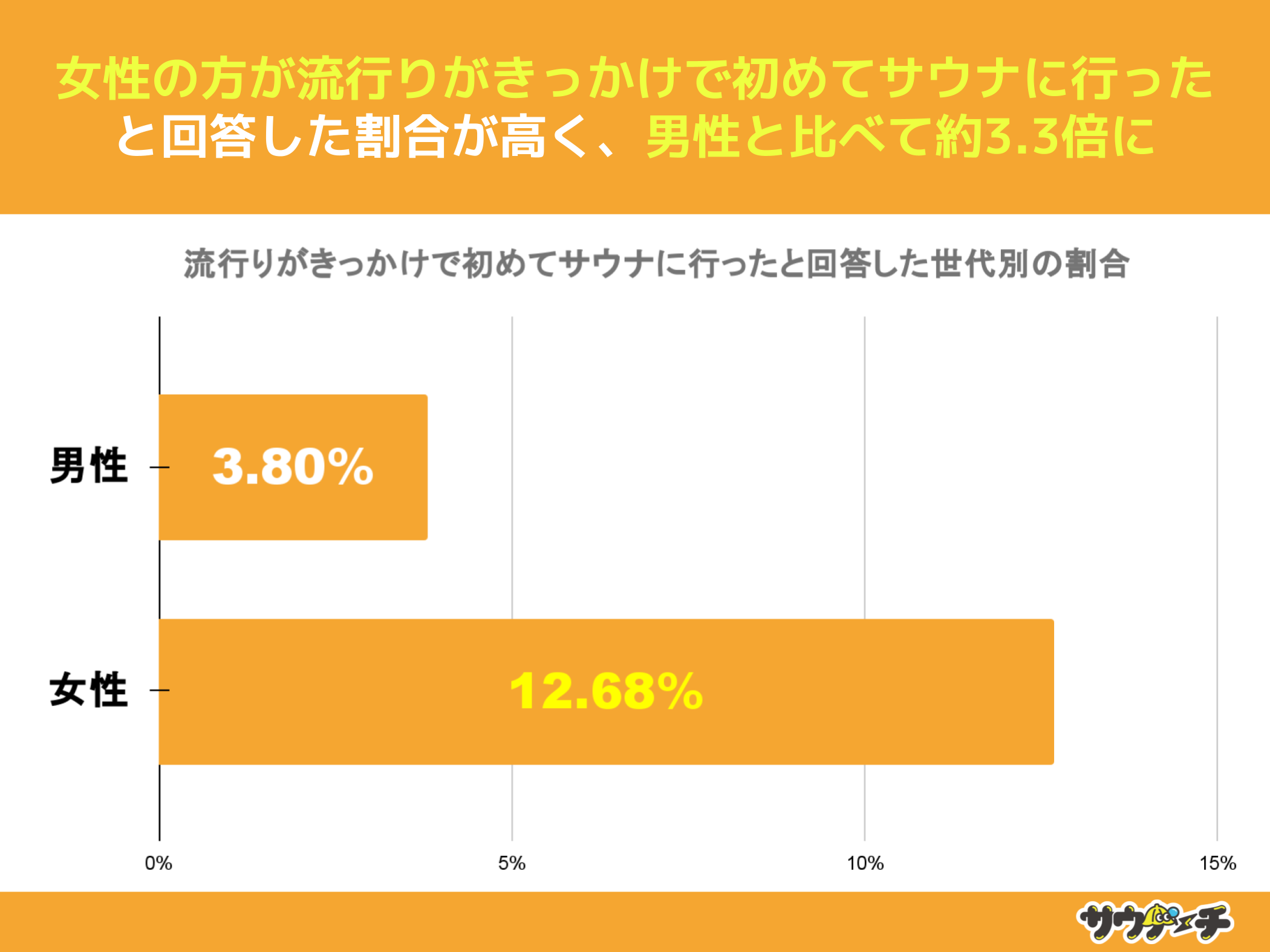 流行りがきっかけで初めてサウナに行ったと回答した割合を男女別でみてみますと、男性が約4%、女性が約13%で、男性と比べて女性は約3.3倍高い結果となりました。