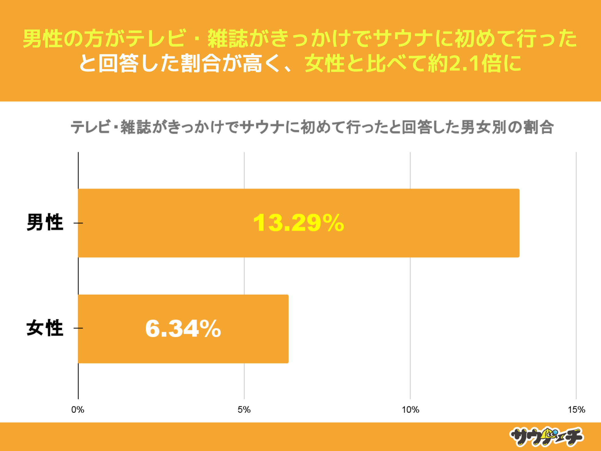 テレビ・雑誌がきっかけでサウナに初めて行ったと回答した割合を男女別でみてみますと、男性が約13%、女性が約6%で、女性と比べて男性は約2.1倍高い結果となりました。
