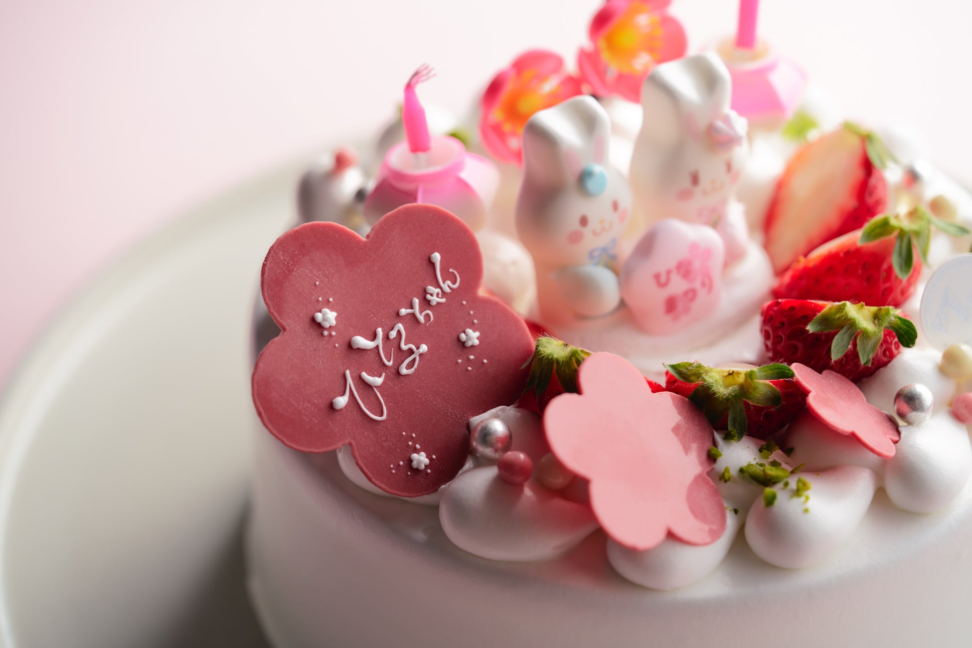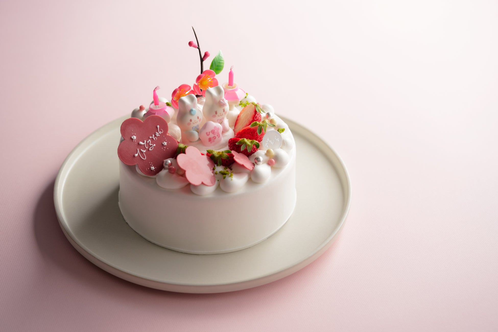雛人形に見立てたうさぎや桃の花を模したピンク色のショコラパーツ、旬のいちごで飾られた