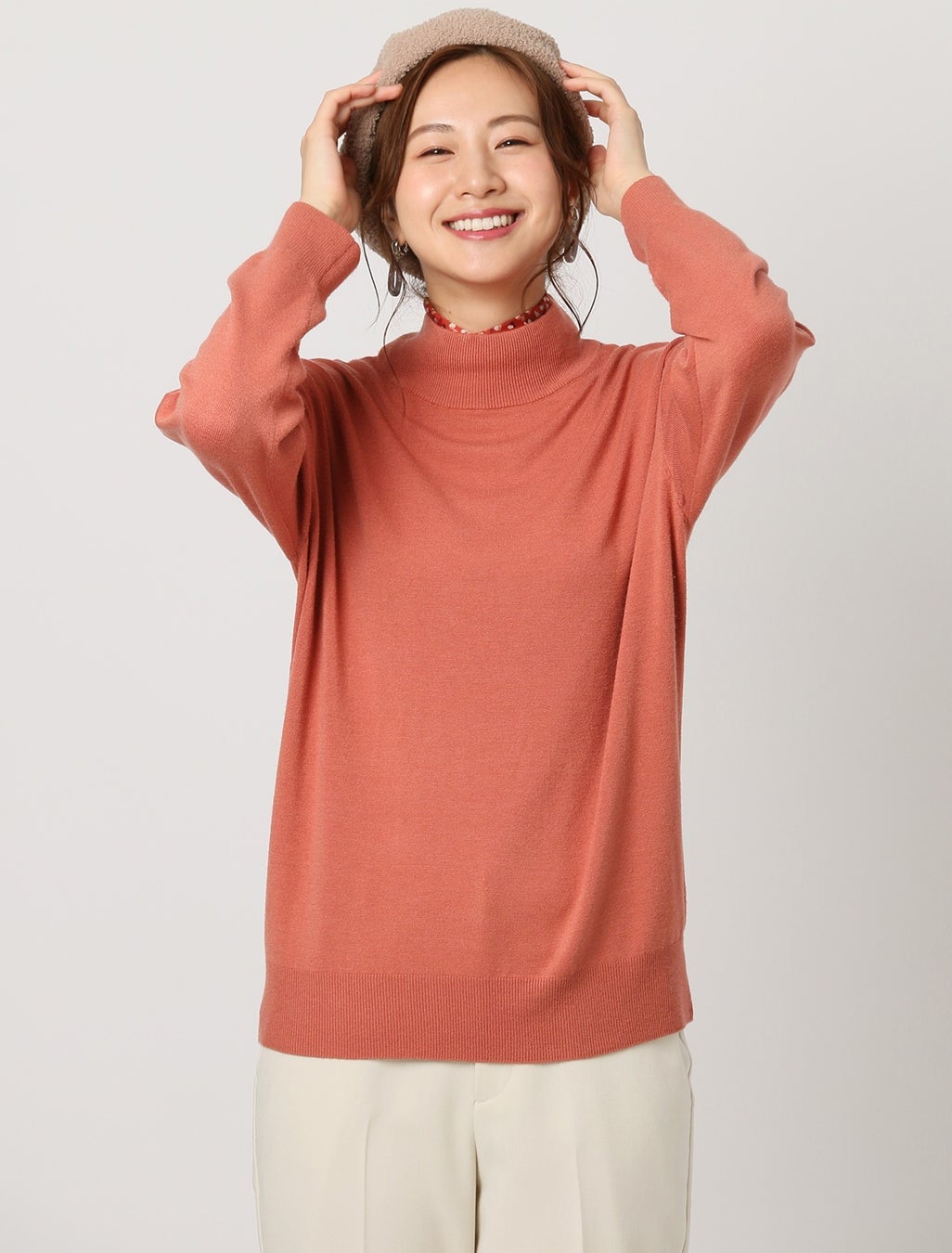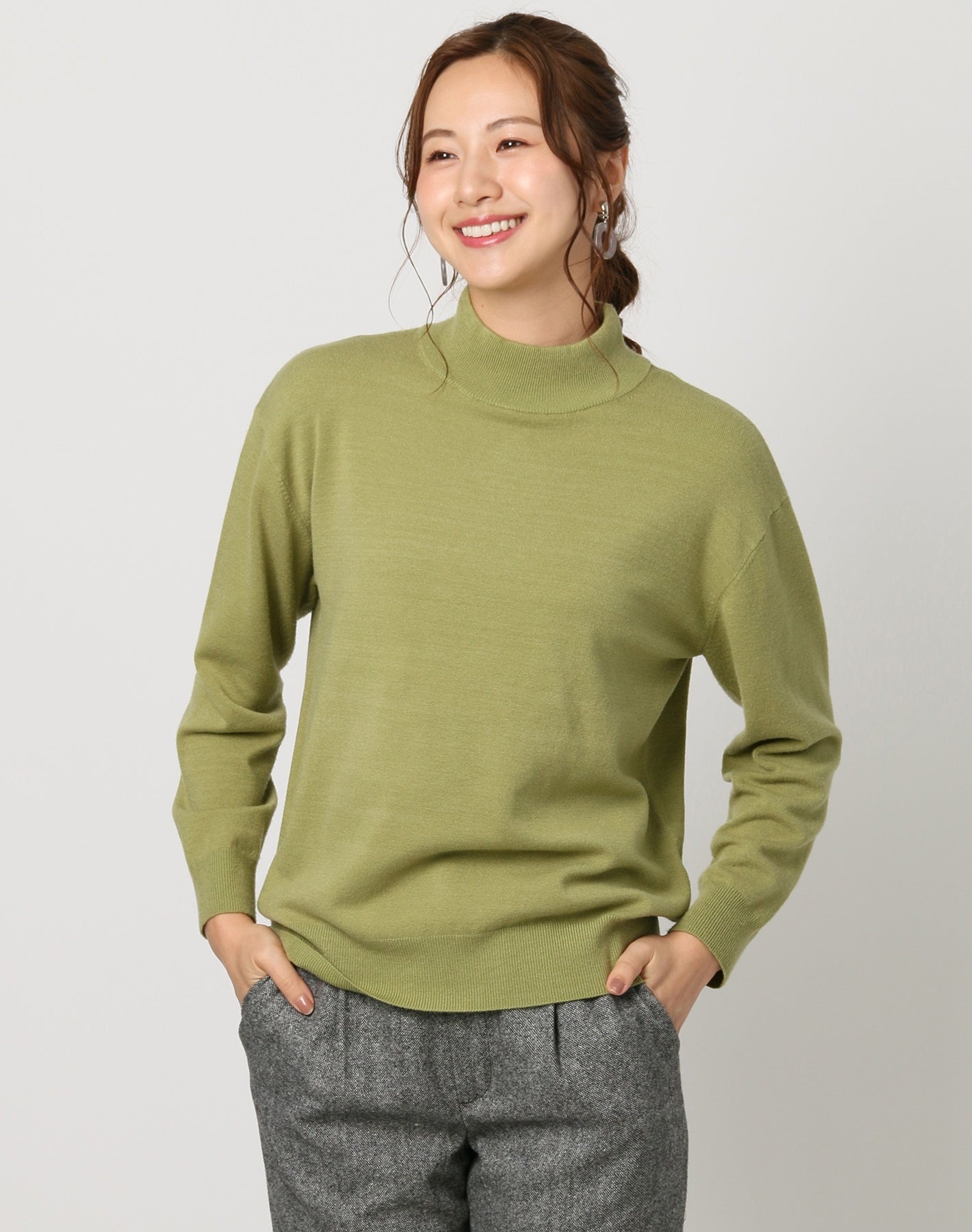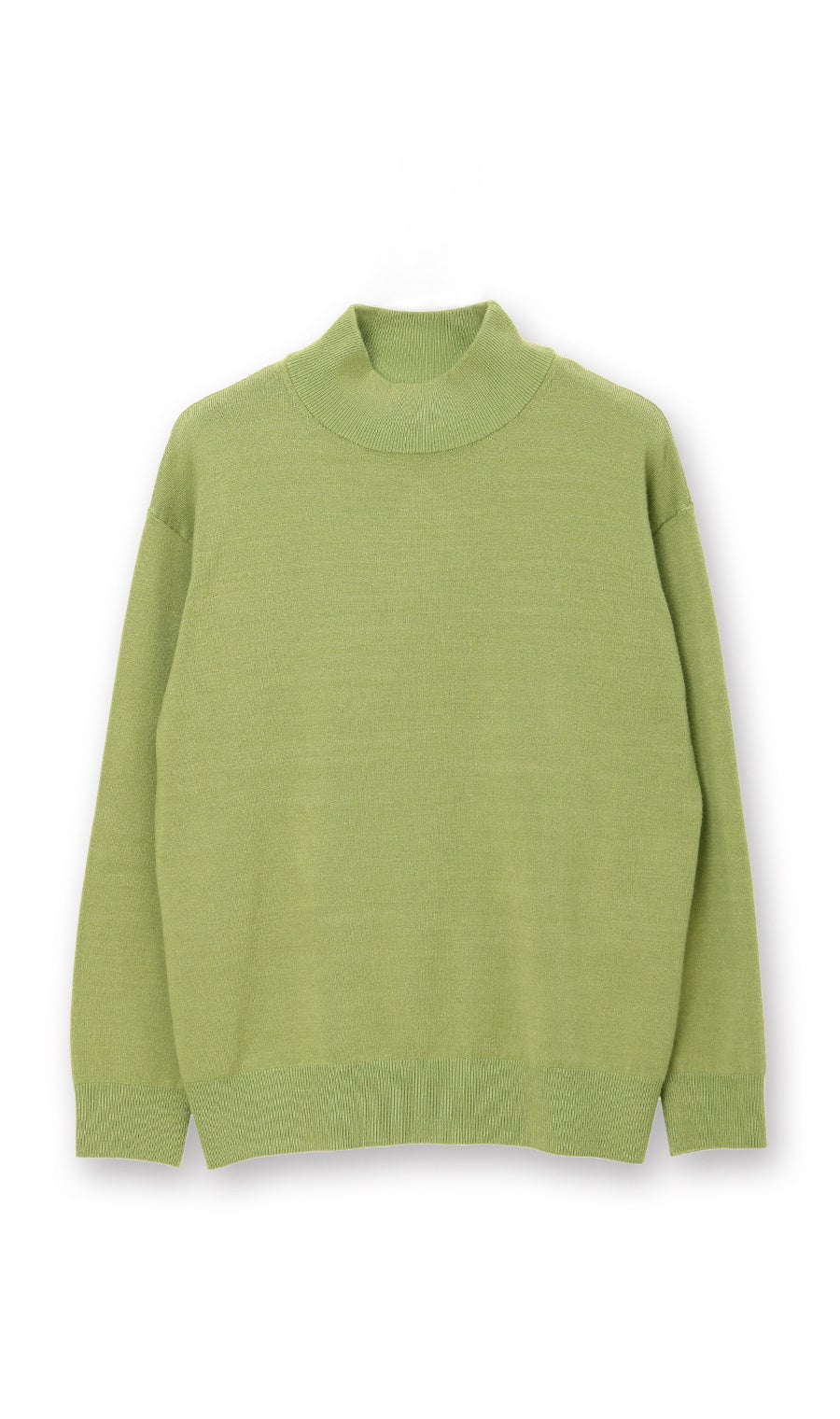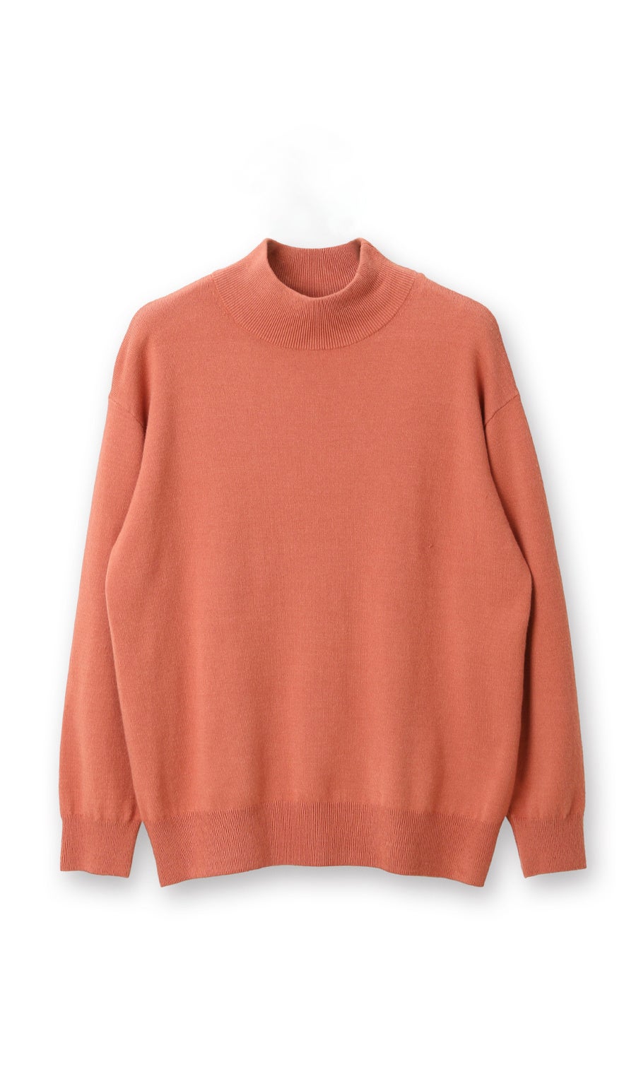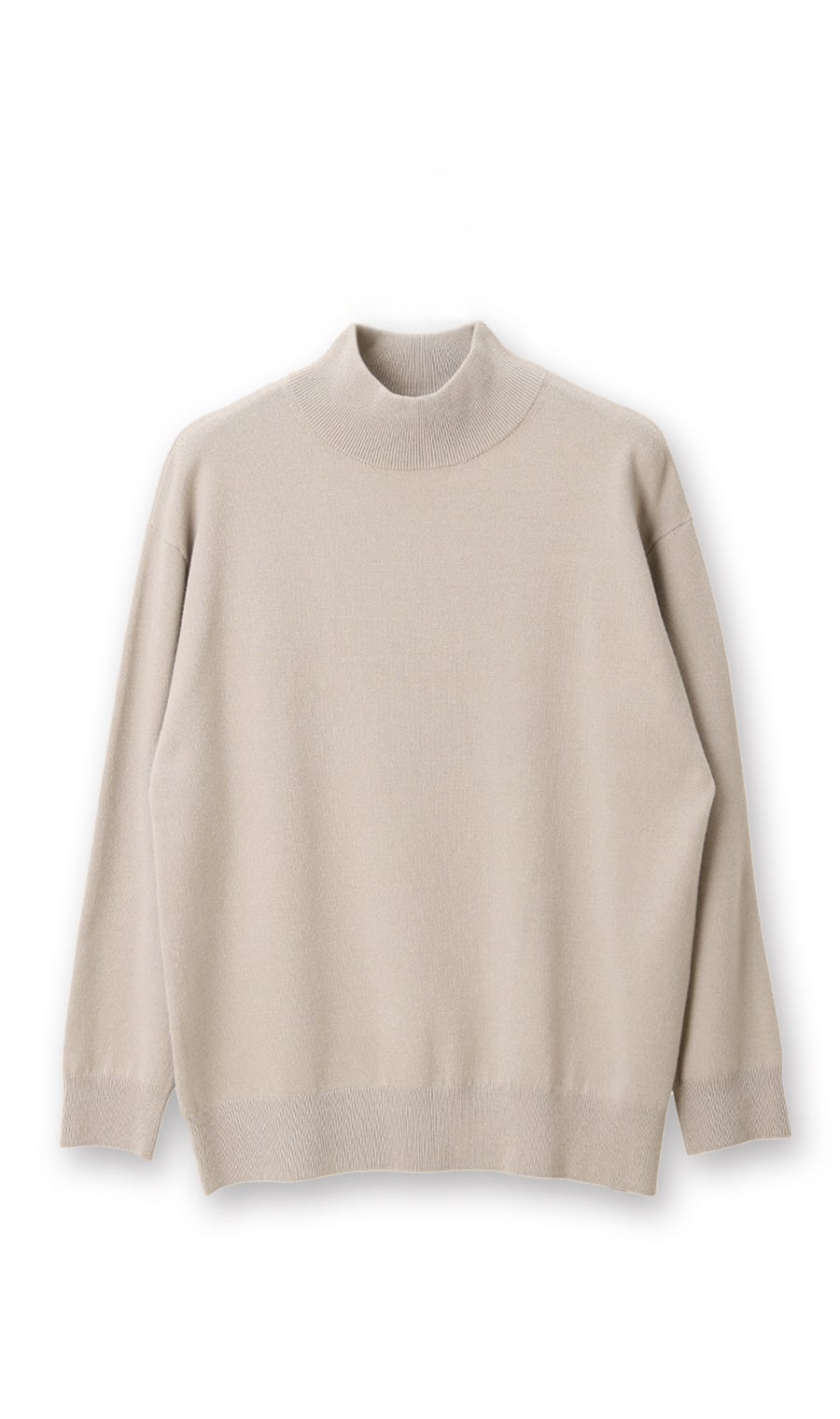 デザインは、ビジネスシーンでジャケットの下にも着用しやすいよう、オーバー過ぎない程よいゆとりのあるシルエットを採用。襟元はやや高さのあるモックネック仕様にすることで、肌との接地面積が増え、暖かさを感じやすくなっています。重ね着をする必要がないほど一枚で暖かく、着ぶくれ知らずのニットです。