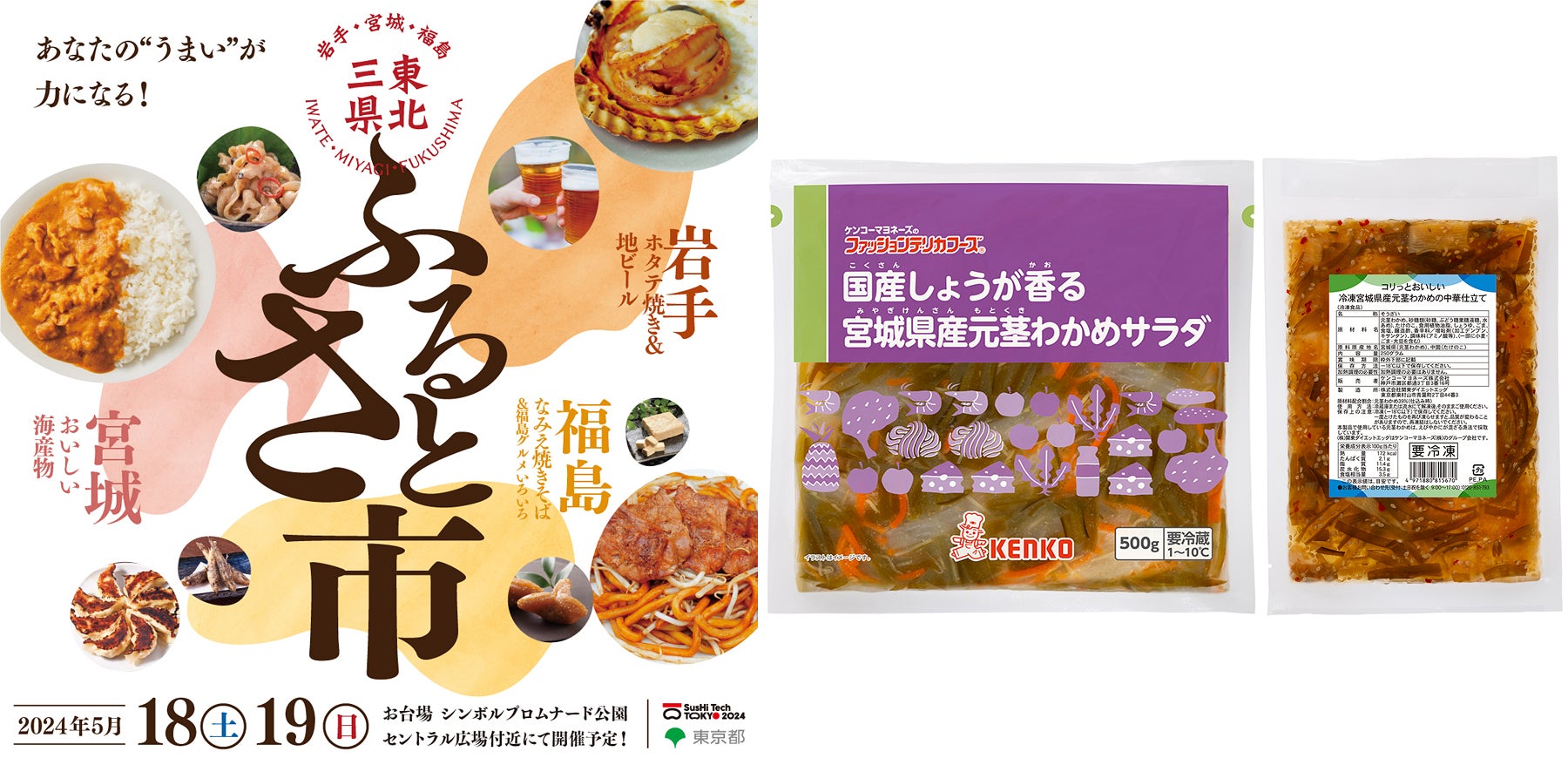 「東北3県ふるさと市」は東日本大震災で甚大な被害を受けた岩手県、宮城県、福島県の復興支援として開催されるイベントで、今回は東京のベイエリア、シンボルプロムナード公園で開催されます。東京都主催のイベントとして「SusHi Tech Tokyo 2024」の開催期間中、一体となって開催されます。ここで出店される宮城県のブースにて、宮城県産元茎わかめを使用した商品『国産しょうが香る宮城県産元茎わかめサラダ』『コリっとおいしい冷凍宮城県産元茎わかめの中華仕立て』などを展示します。