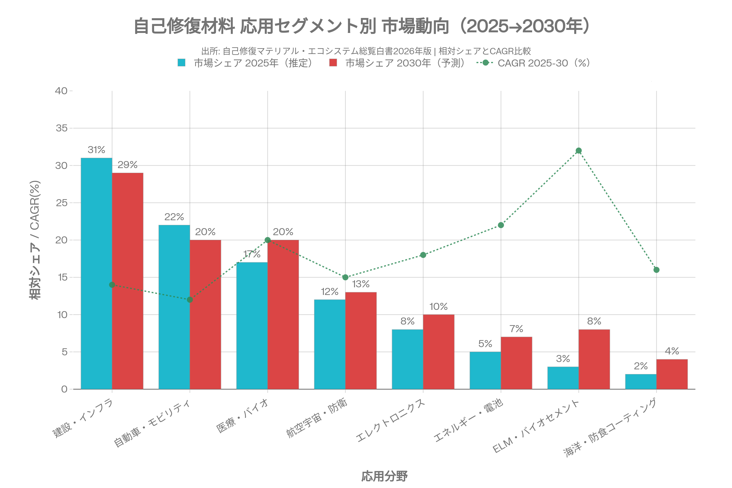 本白書は、自己修復材料(Self-Healing Materials)の全領域を網羅した2026年版の産業白書である。損傷を受けても自律的に修復・回復する「スマートマテリアル」として、建設・インフラ、自動車・モビリティ、医療・バイオ、航空宇宙・防衛、エレクトロニクス、エネルギー、ELM(エンジニアド・リビング・マテリアル)という七大産業領域における同時多発的な技術展開を包括的に解析している。