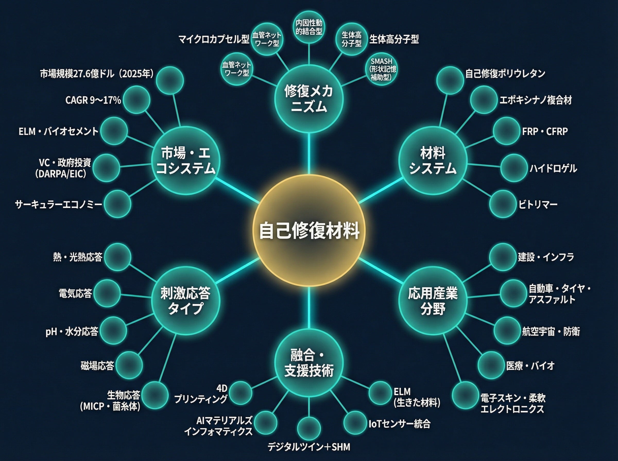自己修復タイヤ(ContiSeal・Selfseal・Sealguard等)、自己修復アスファルト(誘導加熱・高分子添加型)、構造バッテリーコンポジット(SBC)×自己修復FRPの競合状況と市場参入タイミングの検討