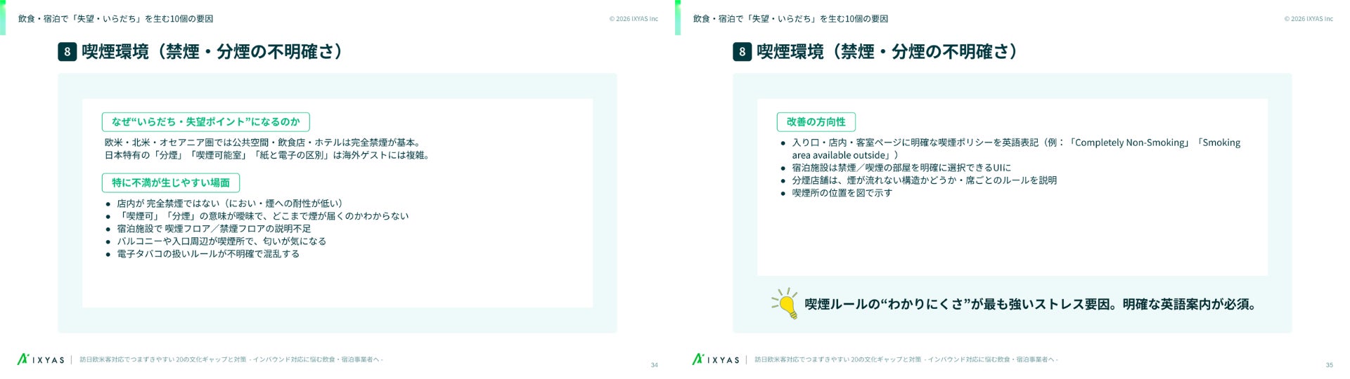 日本の「分煙」や「加熱式タバコ限定」という複雑なルールは、完全禁煙が基本の欧米ゲストにとっては理解しづらく、無意識のうちに満足度に影響を与え得る要因の一つとなることがあります。 本資料では、こうしたギャップを埋めるための「英語表記のテンプレート」など、現場ですぐに活用できる改善案を具体的に提示しています。