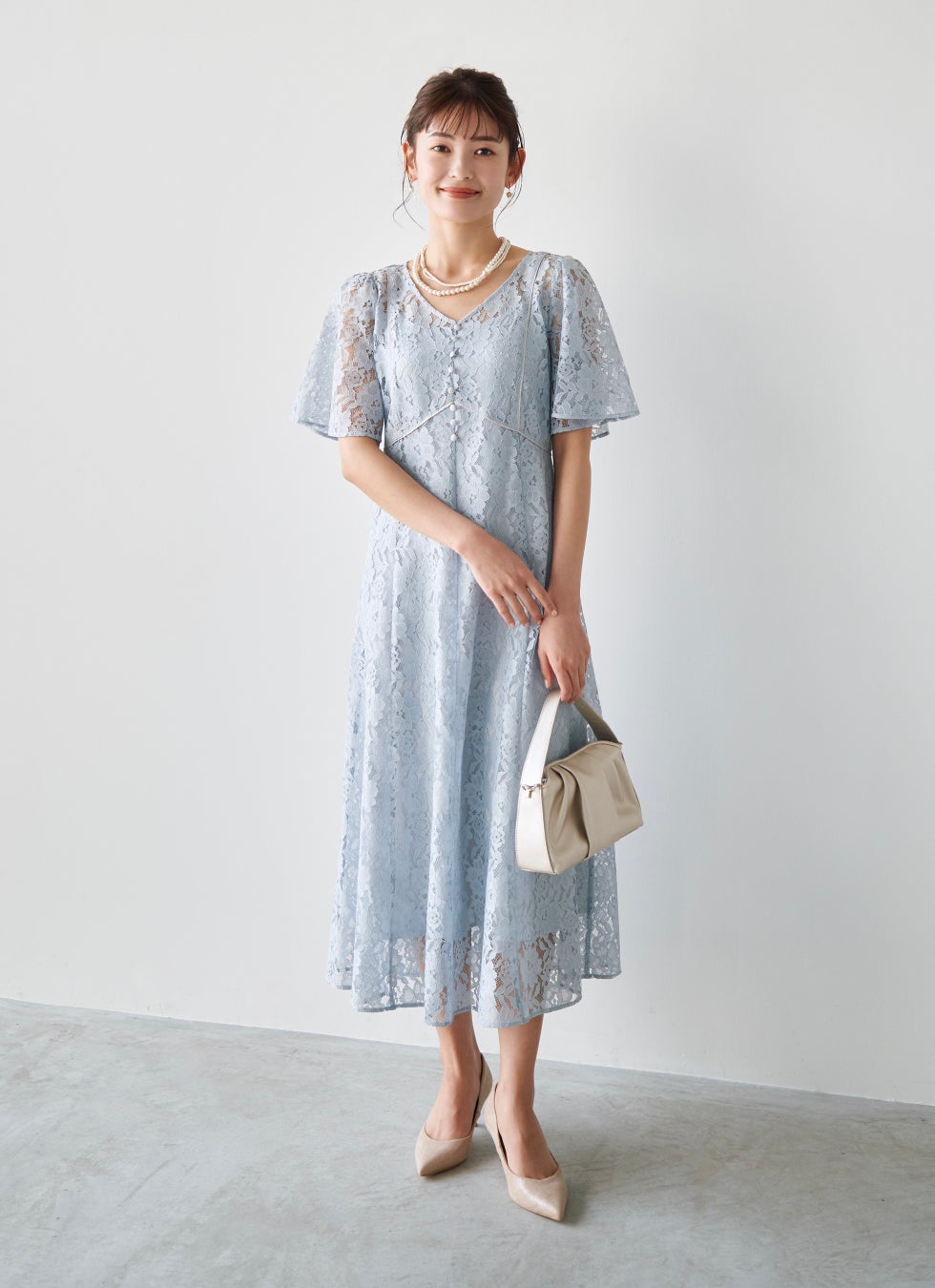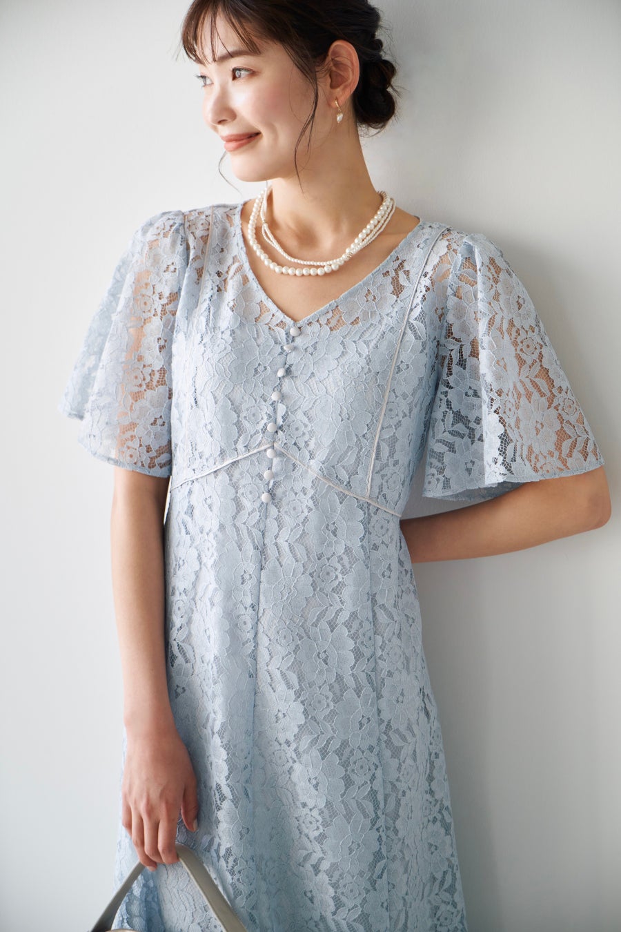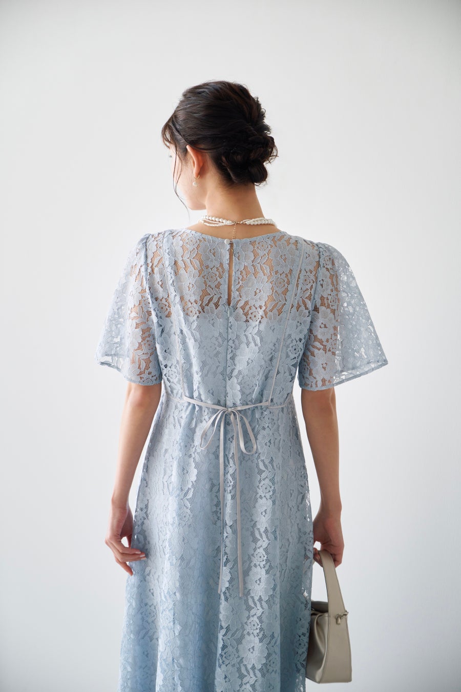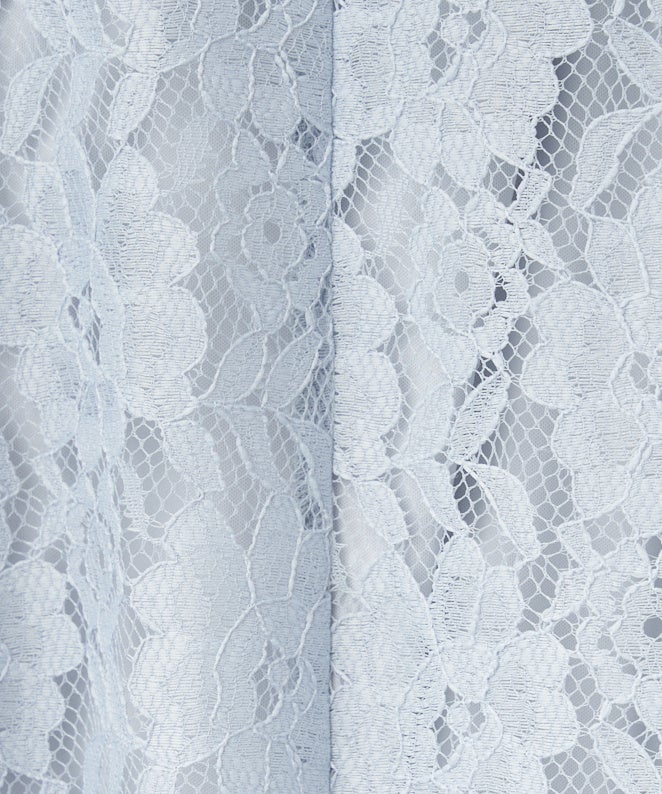 総レースで贅沢に仕上げたドレス。オンライン限定カラーは上品な淡いライトブルーを展開します。