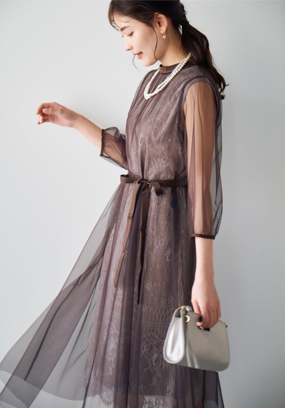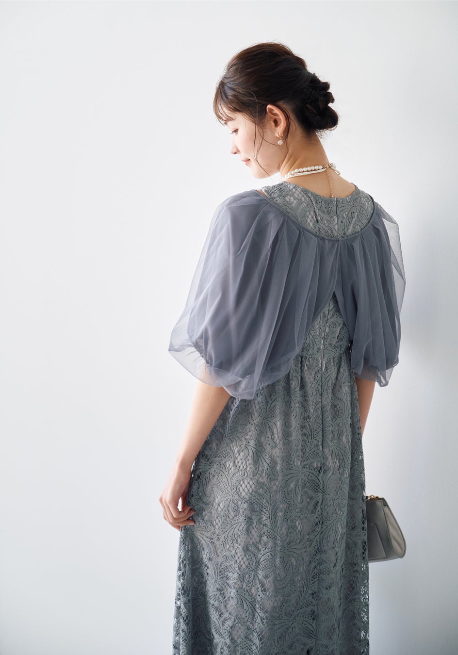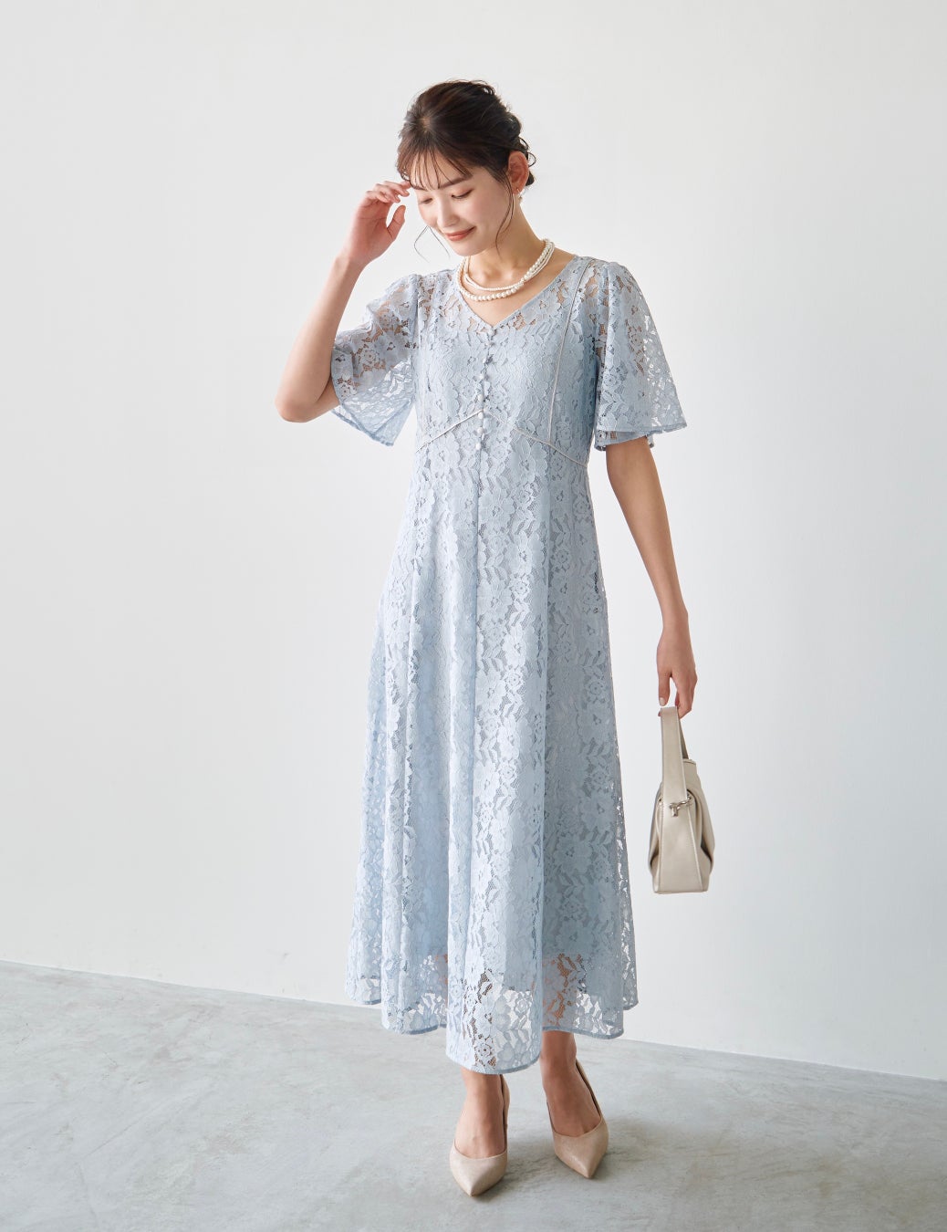 総レースで贅沢に仕上げたドレス。オンライン限定カラーは上品な淡いライトブルーを展開します。