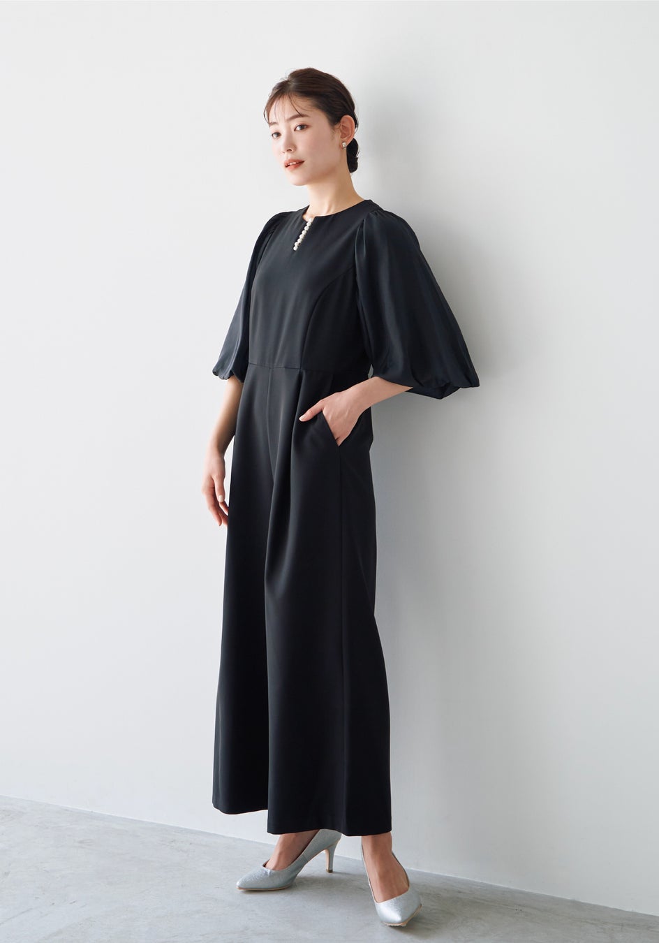 後ろウエストにはパイピングと同色のサテンリボンをあしらい、360度 "映え" が叶うデザインに。リボンの締め具合でウエストを調節できるため、妊娠中や産後すぐのお呼ばれにもおすすめです。