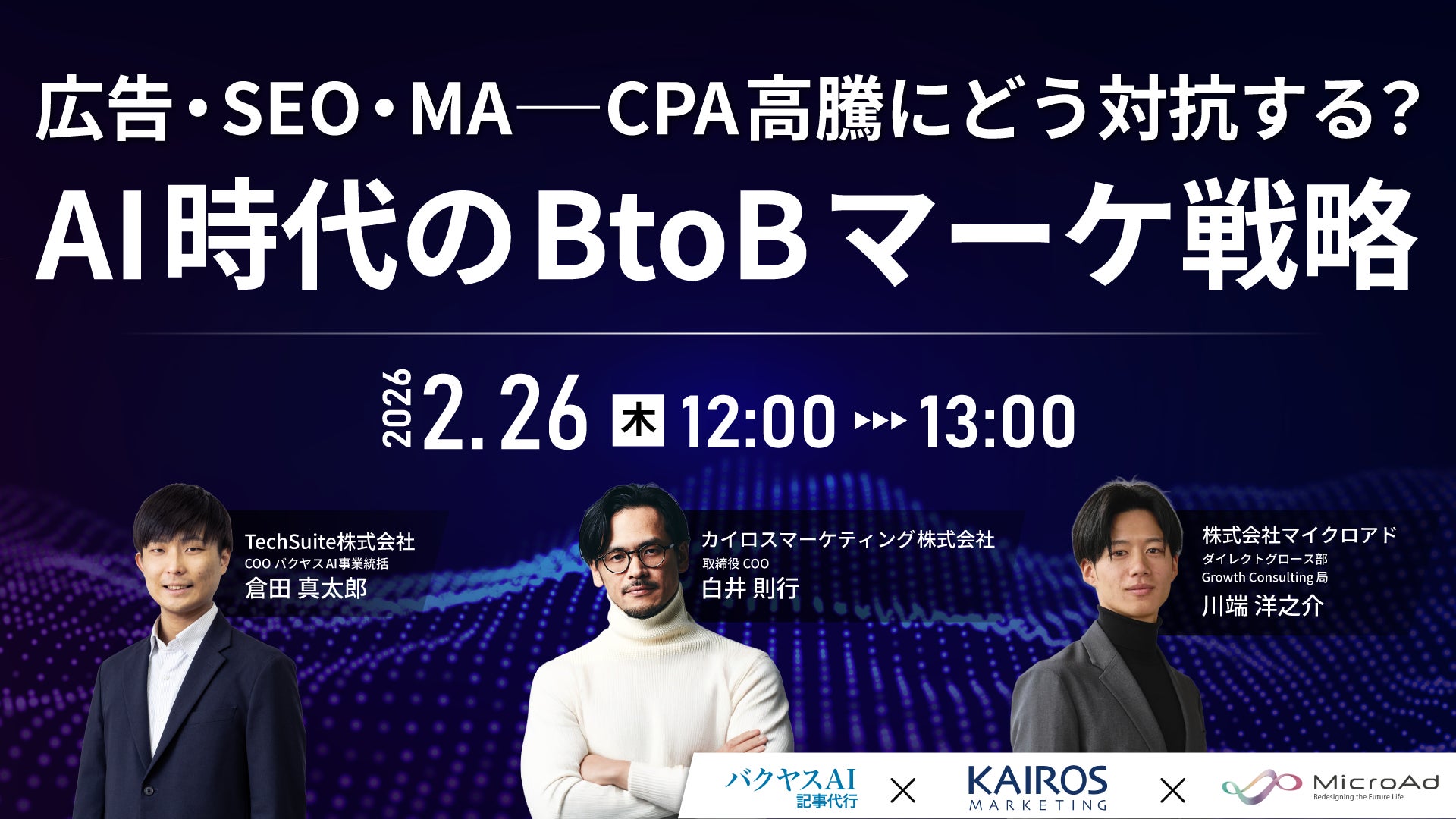 【2月26日(木)|3社共催ウェビナー開催のお知らせ】「広告・SEO・MA──CPA高騰にどう対抗する?AI時代のBtoBマーケ戦略」にバクヤスAI 記事代行が登壇