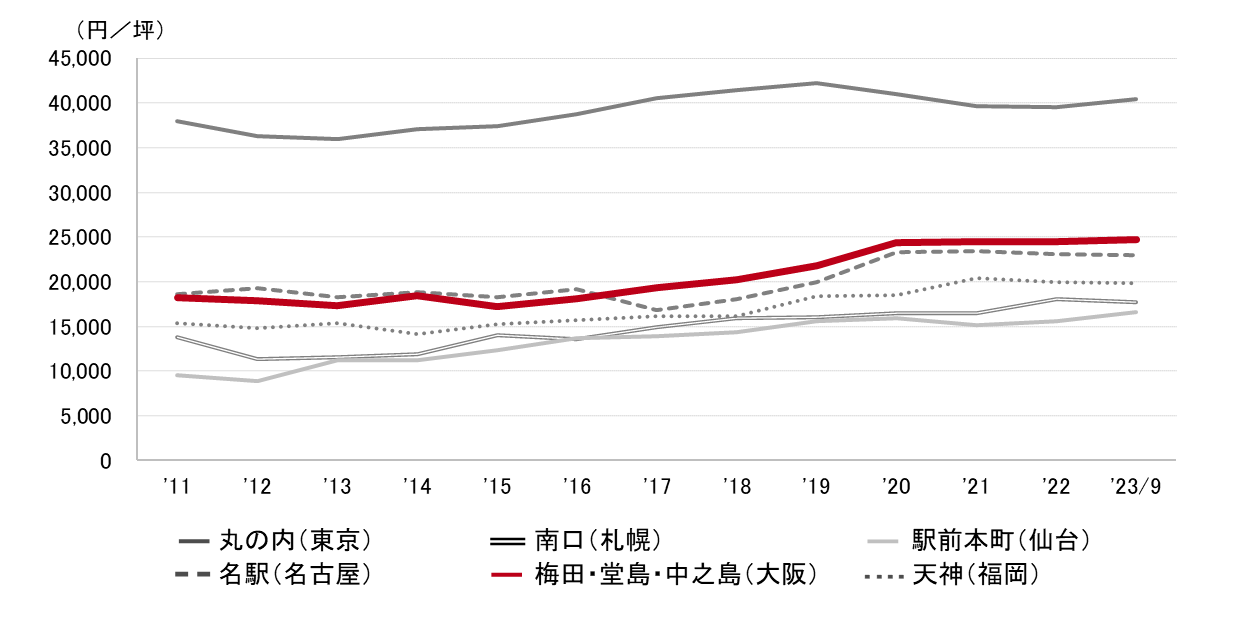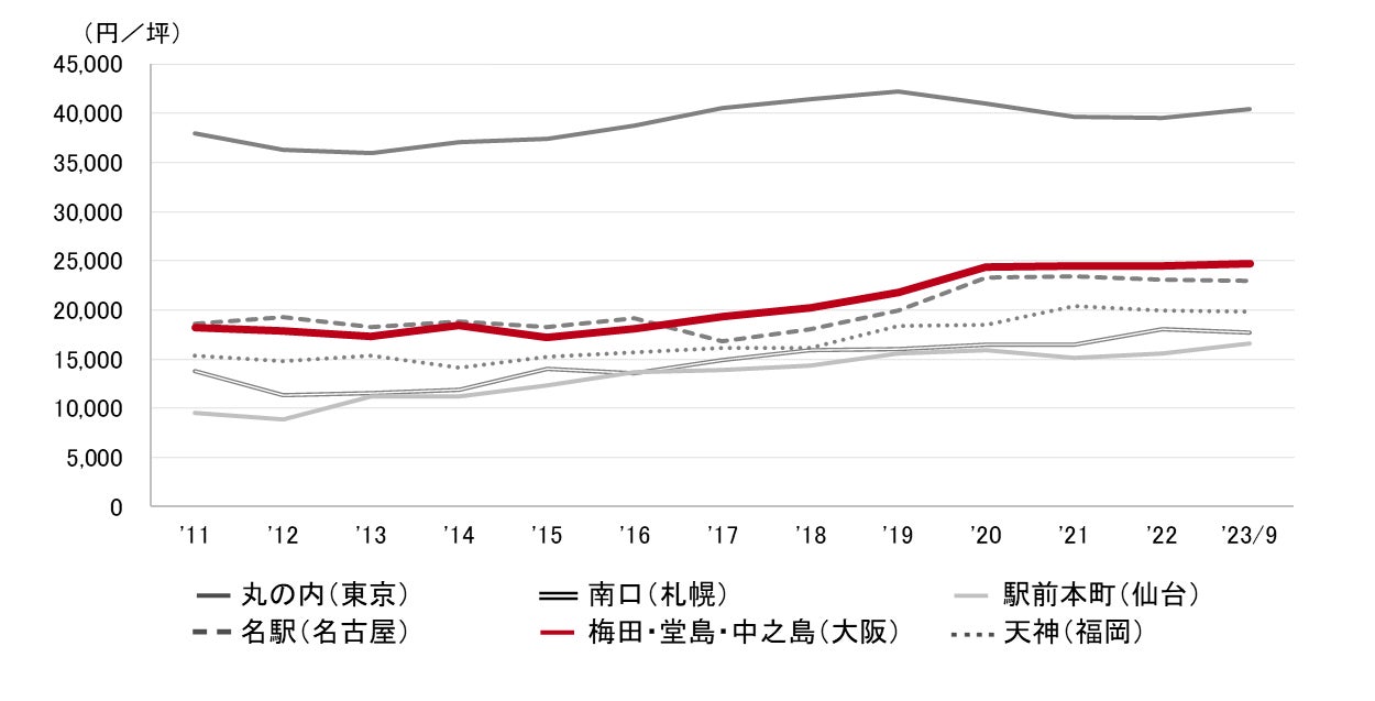 今年の新規供給は低水準に止まる一方、来年は約8万坪の大量供給が予定され、大阪駅周辺を中心に大規模ビルが竣工する。経済活動の活発化に伴い大口の需要が増えていることを背景に、来年竣工予定の建築中ビルでは徐々にテナントの内定が出始めている。梅田駅周辺を中心とする高価格帯の既存ビルでは、先行きのマーケットに対する警戒感もあり、賃貸条件や貸室の分割に関して柔軟に対応するケースが増えている。(大阪支店長 齊藤典弘)
