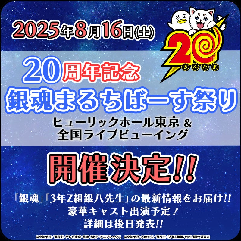 さらに、8月16日(土)にはヒューリックホール東京と全国ライブビューイングにて『20周年記念 銀魂まるちばーす祭り』の開催が決定!