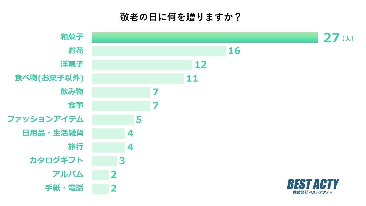 敬老の日に贈るものについて100人にアンケートを行ったところ、「和菓子」と回答する人が最も多い結果となりました。