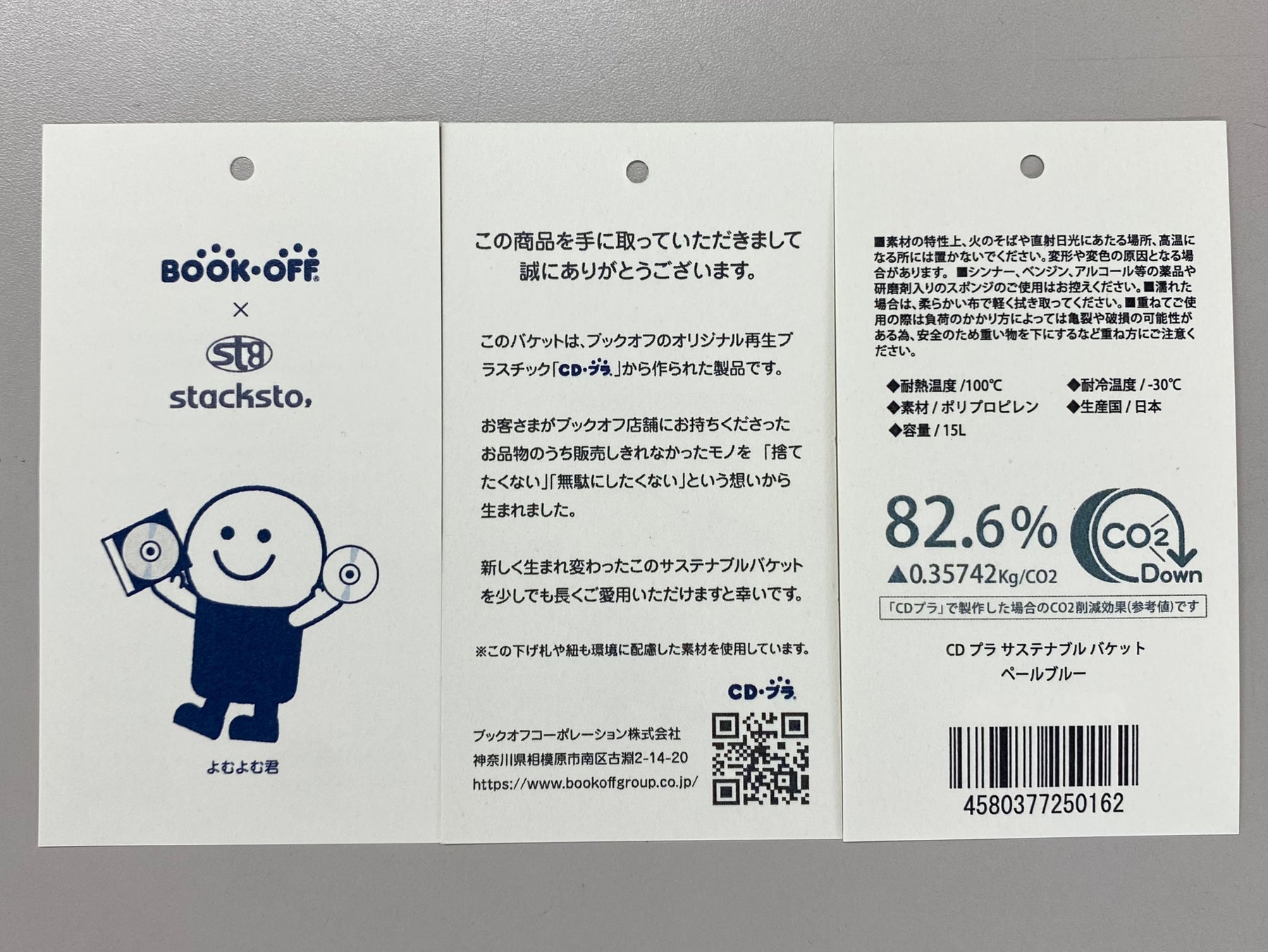 2021年に初の商品化として、多摩美術大学の学生がデザインした「トレー」3種を製作し、このたびスタックストーとのコラボレーションにより、「CDプラ」を100%使用した「バケット」を製作、一部BOOKOFF店頭にて販売開始いたしました。今後も他社とのコラボレーションを通じて様々なデザイン商品を企画・製造することで「生活を彩るサステナブル」な価値の提供につなげてまいります。