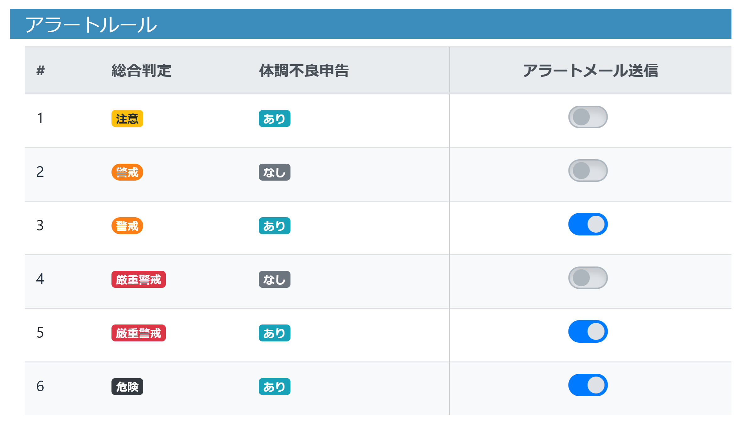 緊急時の適切な判断と対応を現場で実践するため、アラートの通知条件をカスタマイズして設定可能とし、事業者が策定すべき対応手順の実効性向上を支援します。