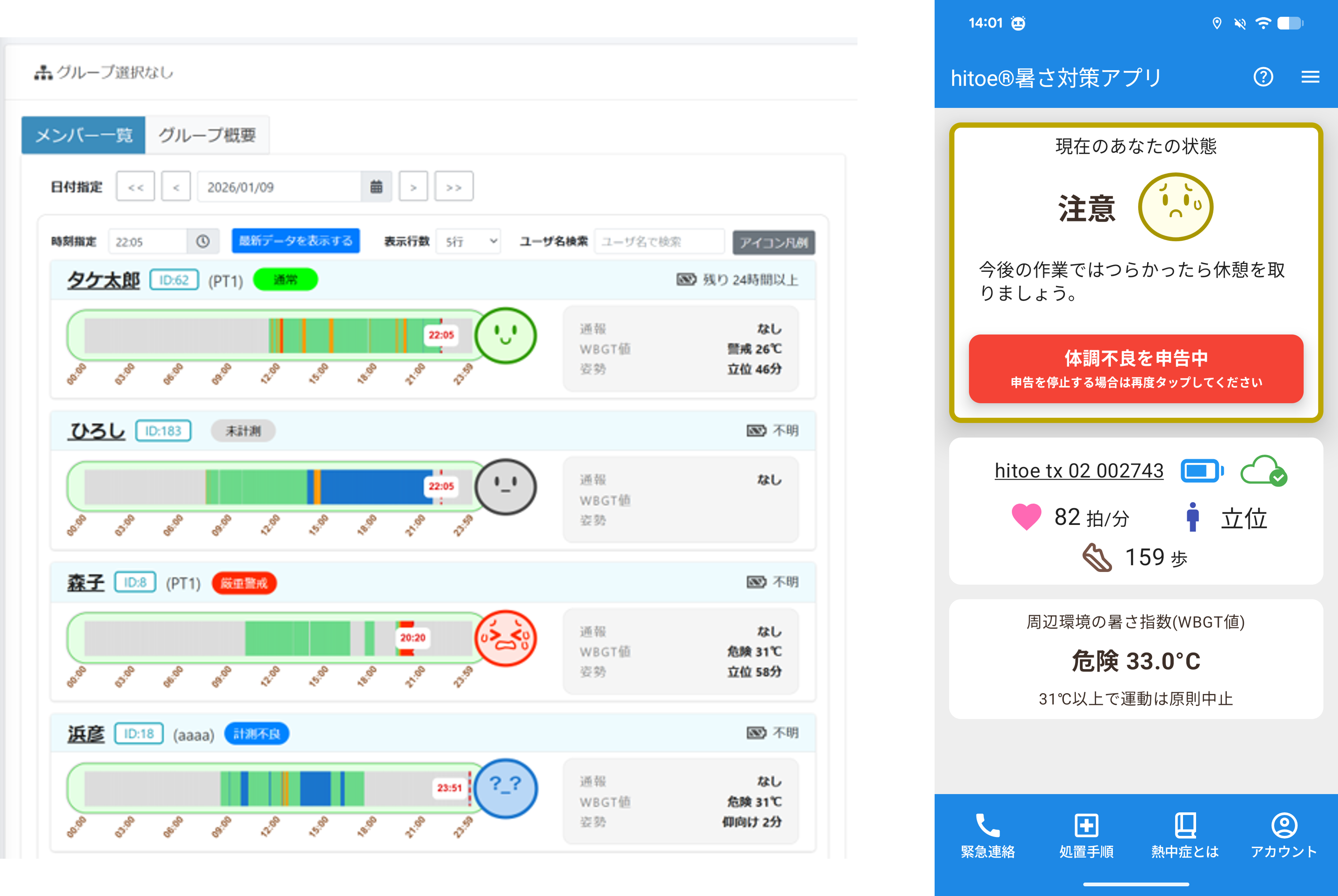 当社はこれまで、胸部に取り付けるウェアラブルセンサー「hitoe®」とスマートフォンアプリを連携して作業者の体調変化を早期に検知・管理する「hitoe®暑さ対策サービス for Cloud」を提供してきました。本サービスは、管理者がウェブシステムの画面から遠隔地にいる作業者も含む複数の作業者の状況を一括で監視できる管理者用機能と、作業者個々人がスマートフォンアプリで自身の体調を確認できる仕組みで構成されています。新バージョンでは、改正労働安全衛生規則に対応する機能追加により、管理者並びに作業者が規則に即した対応をより簡易に実施できるよう強化しました。これにより、遠隔地を含む複数の作業者の体調不良に関するリスクの予兆を早期に発見し、適切な対応を行うことで、労務管理の改善に貢献します。