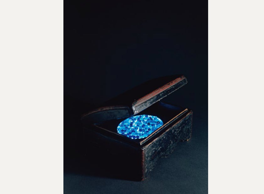 展示終盤には、本展3章のタイトルともなった、「根来の新境地」をご覧いただきます。中でもこちらは、現代美術家・杉本博司氏によるもので、古墳から発見されたガラス玉と、室町時代の根来経箱を取り合わせた《瑠璃の浄土》は、時代を越えて赤と黒の漆に宿る新たな魅力を私たちに語りかけてくれるでしょう。