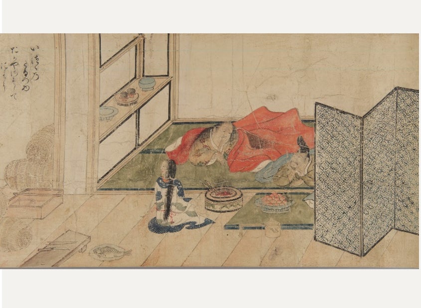室町時代に流行したお伽草子の一つで、こちらは絵巻形式で構成されており、とある長者の出世譚とそれを羨んだ者の失敗談が描かれています。登場人物の背景には、茶器や酒器などの器が描き込まれており、赤と黒の漆で彩られた調度類が当時の生活に密着していた様子がよくわかります。