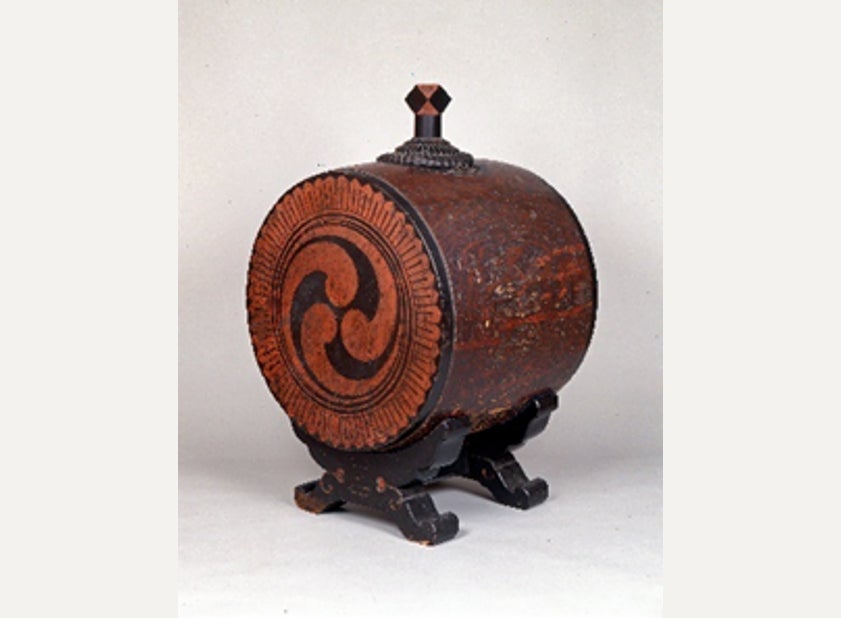 太鼓樽は瓶子、指樽、銚子といった器と同様に酒器の一種であり、人々の饗宴にも重宝されてきました。こちらの太鼓樽は、スギ材の一木を刳り抜いて作られ、注ぎ口には鉄製の懸金具をもうけ、鼓面には剣巴文を描くなど見所満載です。銘からは、高野山・山王院の什器として寄進されたことや、塗師の名前がわかることから極めて重要な基準作となっています。