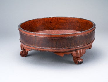 根来はもともと仏器として用いられることが多かったとされ、この布薩盥もその一つです。寺院で半月に一度自己の行いを顧み、罪過を懺悔する布薩会(ふさつえ)で用いられてきました。布薩盥には「恵範」「細工根来寺重宗」の銘があり、当時の僧侶と根來寺とを結びつける貴重な手がかりとなっています。