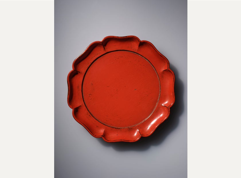 縁を花びらのすがたに象った盆で、中国伝来の器物の形を写しとっています。特に大型の輪花盆は、中世の絵画資料にみられる喫茶や宴席の場面などにも描かれており、日常的に使用されていました。本作は長年の使用や手擦れによって、朱漆が磨滅し、下に塗った黒漆が表面に見えています。装飾を最低限に抑えた形の美しさや優れた耐久性に加え、ありのままの無作為な姿は、近現代の茶人をはじめとする美術コレクターたちをも魅了し、鑑賞の対象となっています。