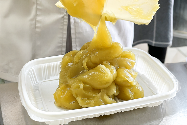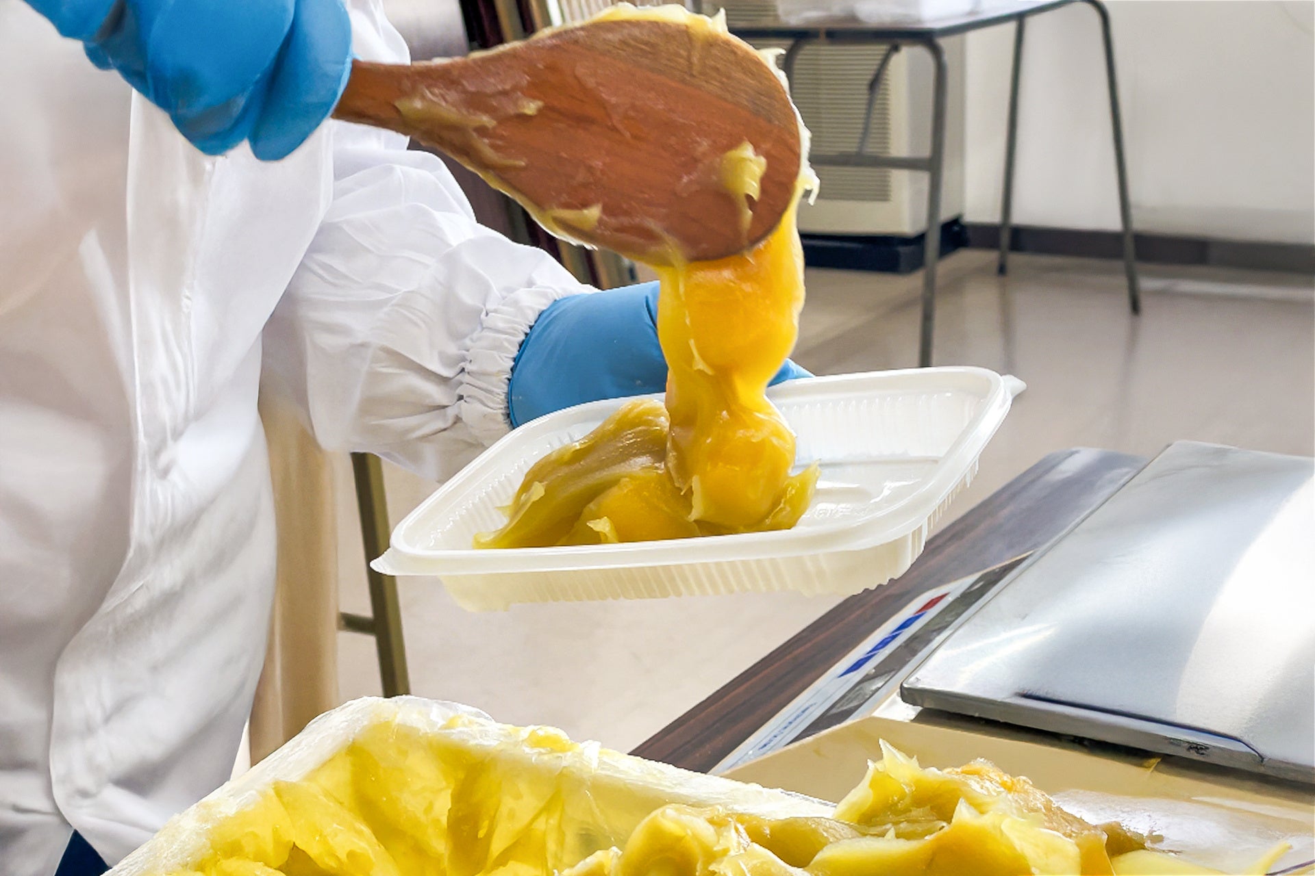 たいようの栗きんとんで使用するのは、厳選した栗をふっくらと炊き上げた甘露煮と、白あんづくりに最適とされる高品質な豆 「白手亡(しろてぼう)」のみ。