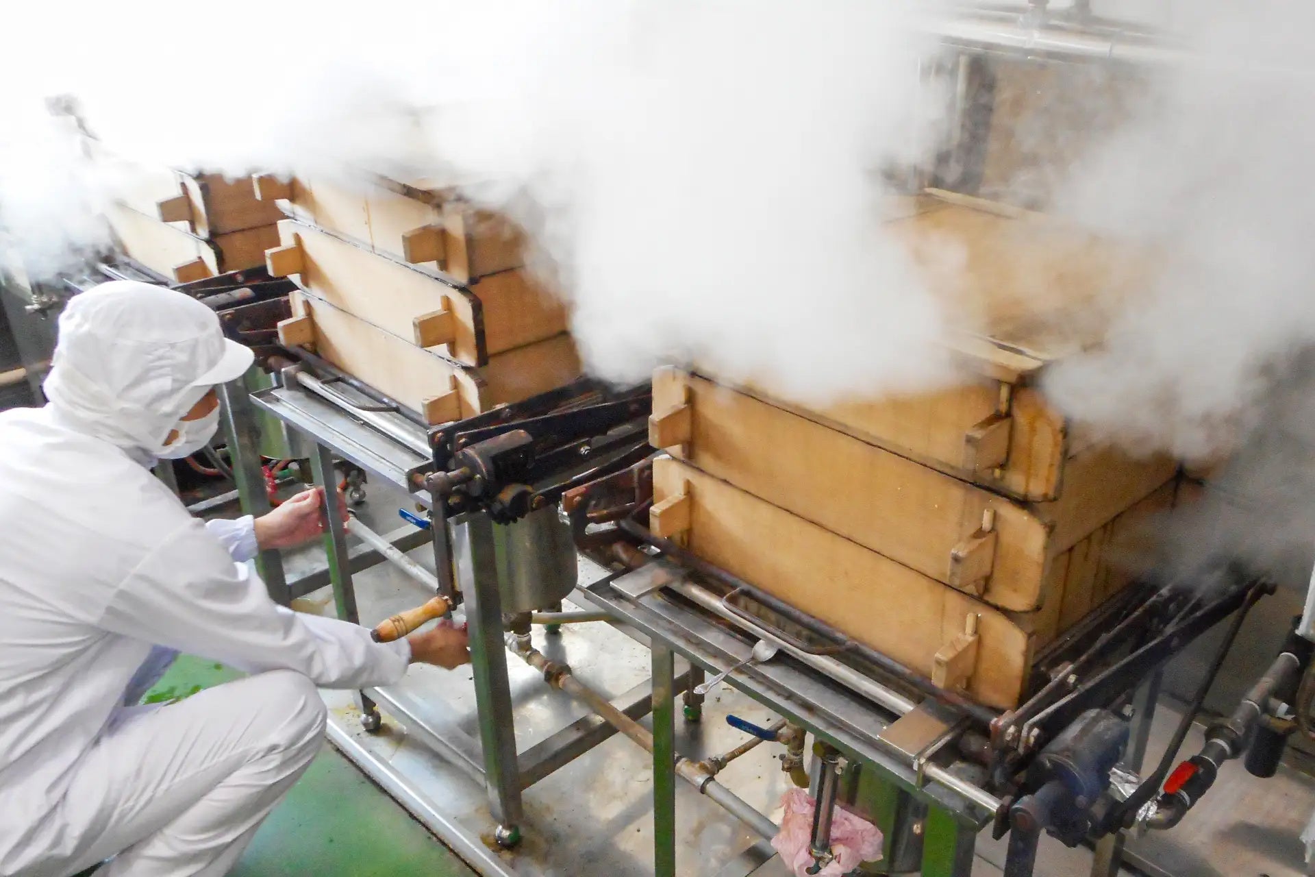 千葉県産最高級もち米「マンゲツモチ」の素材力を最大限に引き出すため、製法にも一切の妥協はしません。他の製法では、このもち米が持つ力強さと上品さ、そしてしなやかな粘りを十分に活かすことができないからです。蒸篭でじっくり蒸し上げることで、米本来の甘みと香りがしっかりと引き立ち、さらに杵つき製法で丁寧につき上げることで余分な空気が抜け、旨み・コシ・なめらかさが一体となった、格別の口あたりへと仕上がります。