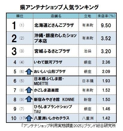株式会社ブランド総合研究所は、東京都内にある全国の道県のアンテナショップ 34店舗について、利用の実態を明らかにするため「第8回アンテナショップ利用実態調査2025」を実施。その結果、1位北海道どさんこプラザ、2位沖縄・銀座わしたショップ本店に次いで3位はなんと2024年12月に閉店したあの店がランクインした。 本調査はインターネットを利用し、2024年10月から11月に実施。首都圏(埼玉県、千葉県、東京都、神奈川県)在住の男女20,000人から回答を得た。