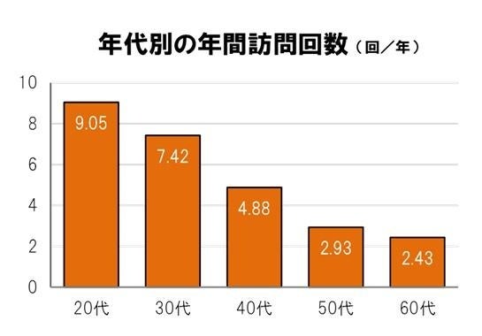 1人当たりの年間訪問回数を年代別に分析すると、20代が9.05回(利用しない人を含む)で最も多く、次いで30代が7.42回と年代が低いほど高くなっている。つまり20代は60代以上の4倍近く訪問していることになる。