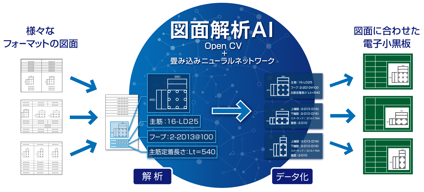 前処理として、Open CV等の画像解析系のフレームワークを活用して読み込んだ配筋リストのPDFを画像化し、ディープラーニングの入力層に適した処理を行います。その後はニューラルネットワークの入力層に投げ込み、畳み込みニューラルネットワークの畳み込み層や分類層に対しては、蔵衛門オリジナルのチューニングを複雑かつ適正に施します。この部分で電子小黒板として分類を完了させるディープラーニング処理を実行します。これにより人の手を介することなく電子小黒板を作成することに成功しました。今後は多くの配筋リストからの学習を行い、『e-Kokuban』の精度をさらに高めてまいります。