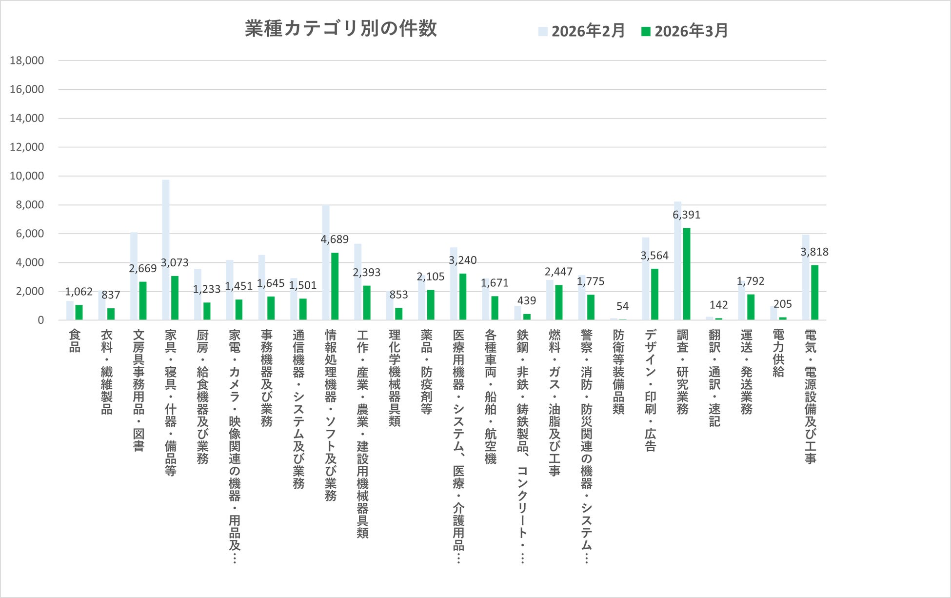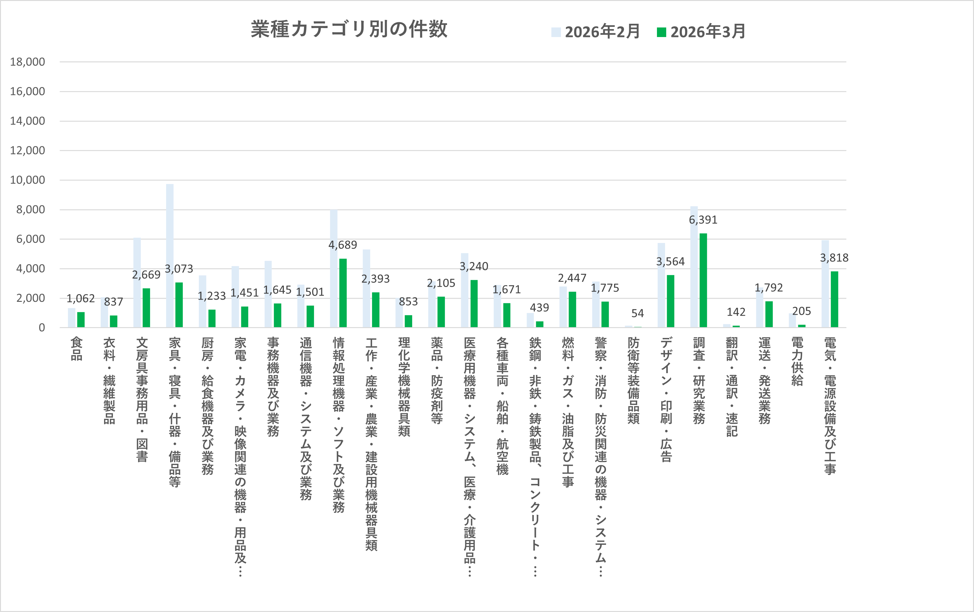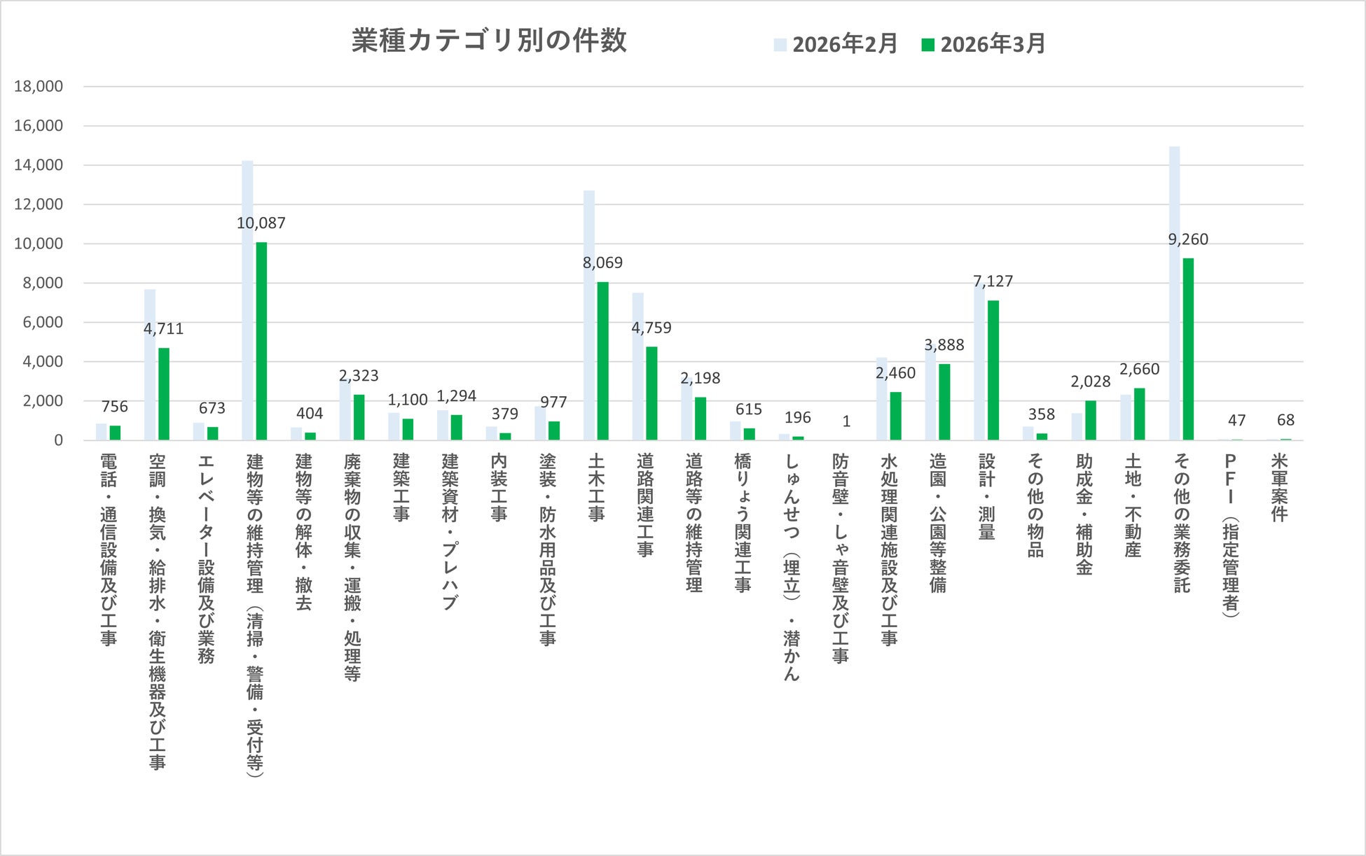 2026年3月の業種別入札件数では、多くのカテゴリで前月から減少が見られました。