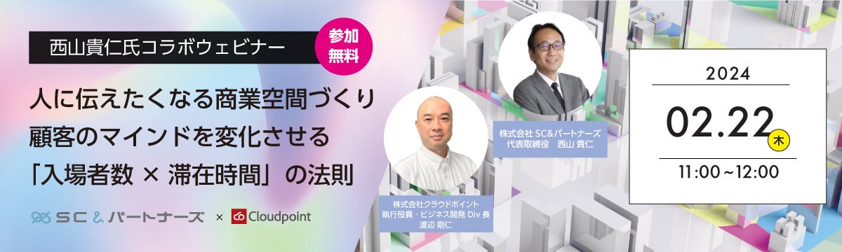 株式会社クラウドポイント(本社:東京都渋谷区、代表取締役:三浦 嚴嗣)と株式会社SC&パートナーズ(本社:東京都港区、代表取締役:西山 貴仁)は2月22日(木)、ウェビナー「西山貴仁氏コラボウェビナー 人に伝えたくなる商業空間づくり 顧客のマインドを変化させる『入場者数×滞在時間』の法則」を開催します。