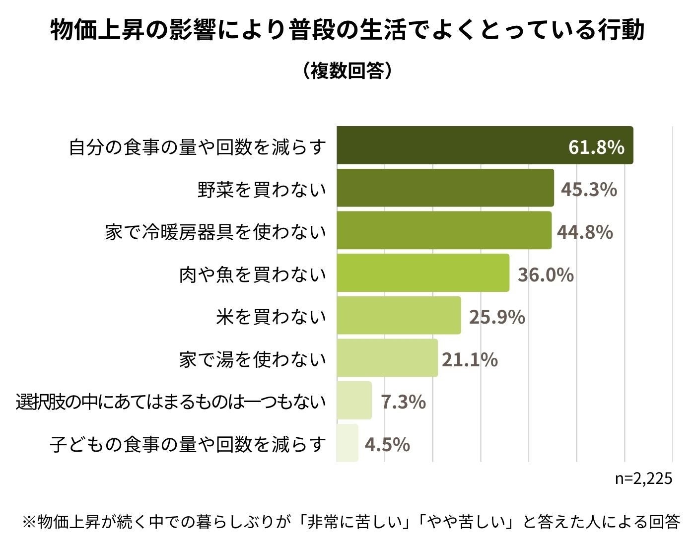 また、上記質問で「非常に苦しい」「やや苦しい」と回答した人に対し、「物価上昇の影響により普段の生活でよくとっている行動」に関する選択肢の中であてはまるものを選択する(複数選択可)形式で質問した結果、「自分の食事の量や回数を減らす」が最も高い割合で選択されました(※)。また、「野菜を買わない」「家で冷暖房器具を使わない」など、健康への影響が懸念される行動が比較的高い割合を示しています。