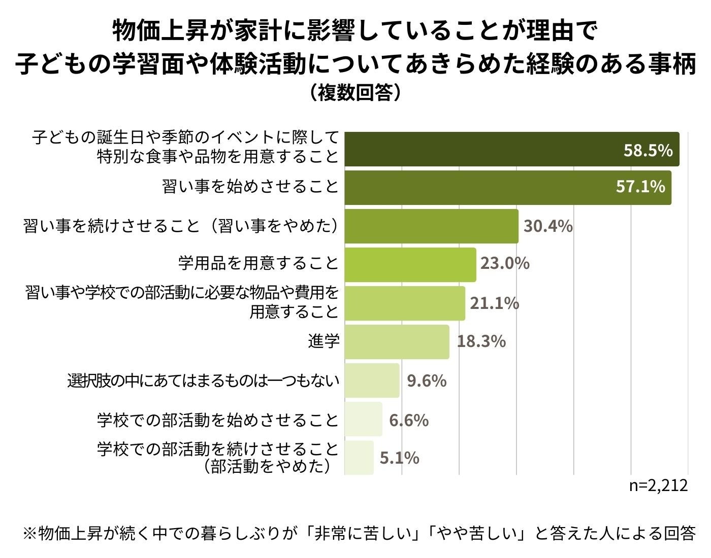 物価上昇の影響は、子どもの学習や体験活動の面にも及んでいます。物価上昇が続く中での暮らしぶりが「非常に苦しい」「やや苦しい」と回答した人に対し、物価上昇の影響で「子どもの学習面や体験活動についてあきらめた経験のある事柄」について聞いたところ、6割近くが「子どもの誕生日や季節のイベントに際して特別な食事や品物を用意すること」「習い事を始めさせること」を選択しました(複数回答)。