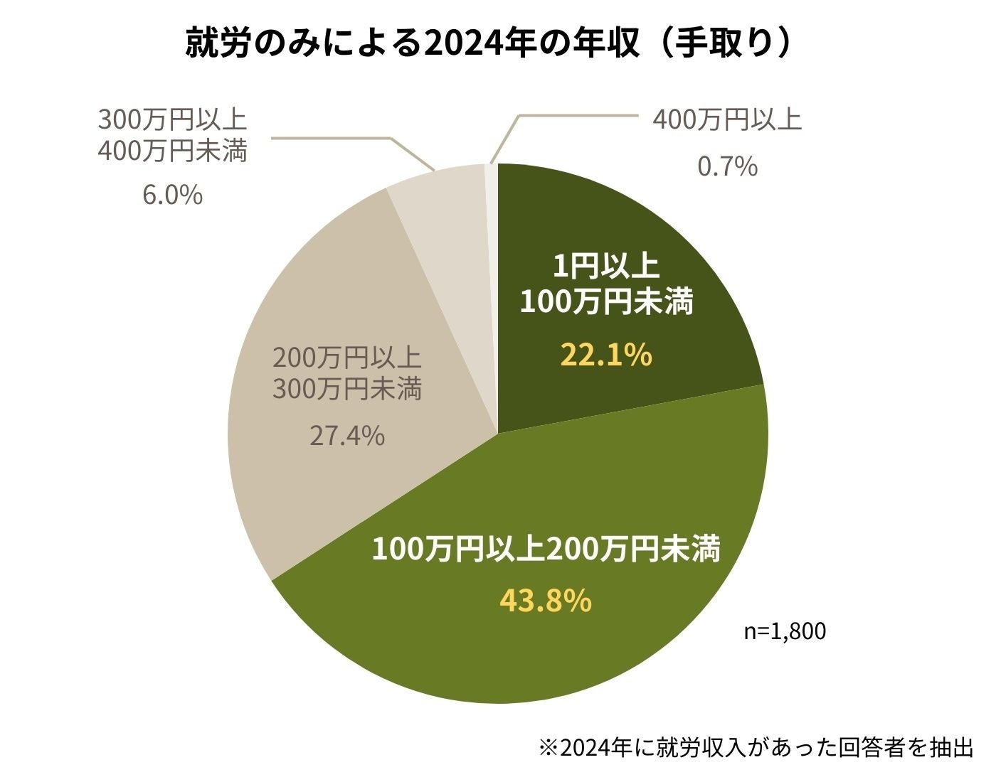 回答者の世帯全体における2024年の年収(各種社会手当・養育費・同居家族の収入含む)について回答を得た結果、世帯年収が200万円に満たない回答者が5割に及びました。