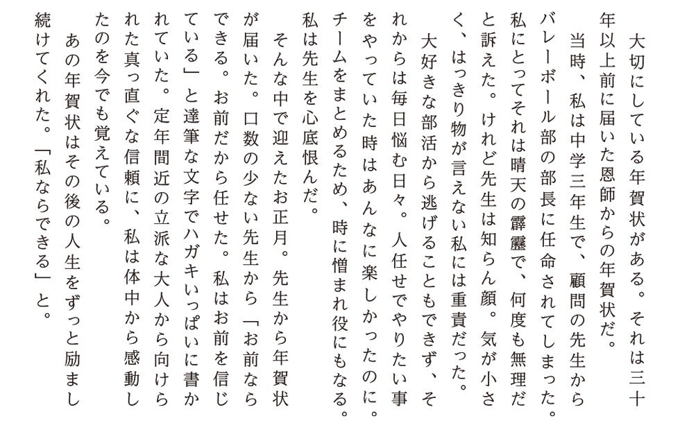 中学生の頃、顧問の先生から思いがけずバレーボール部の部長に任命され、苦労の日々を送る筆者だったが、先生から届いた年賀状に励まされ大きな自信へとつながる。先生の真っ直ぐな信頼が、筆者の成長を促したこのエピソードが第15回の大賞に選ばれました。