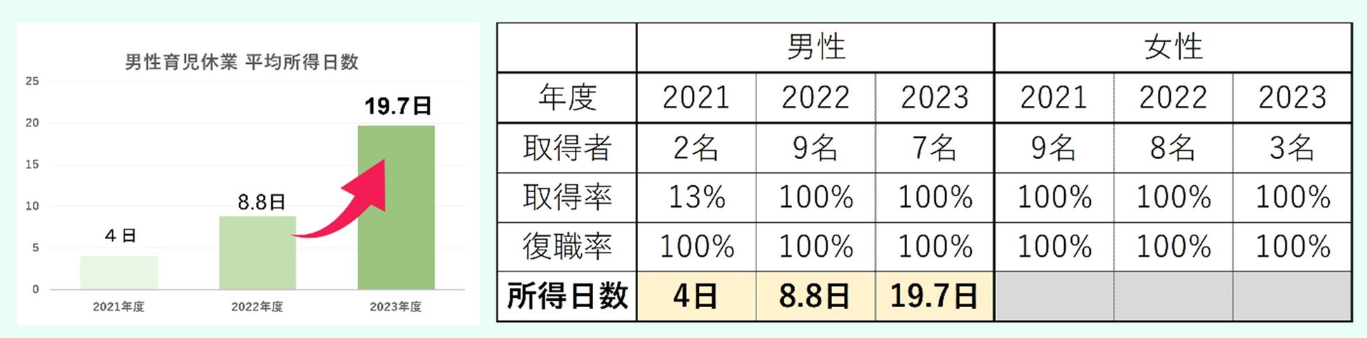 株式会社ワーク・ライフバランスの「男性育休100%宣言」への賛同を皮切りに、育児休業取得者への復職一時金の支給や対象者をサポートする周囲のチームメンバーへのインセンティブ支給制度の制定などを社員の声をもとに、いち早く導入。加えて、社員ごとの状況や希望に合わせた、キャリアを考える「ライフキャリアサポート窓口」を新設し、一人ひとりが活き活きとしたライフキャリアを実現できるようサポートしています。その結果2022年度に引き続き、2023年度においても育休の取得対象である男性社員7名全員が育児休業を取得。平均取得日数も昨年度の「8.8日」から、平均「19.7日」に増加しています。