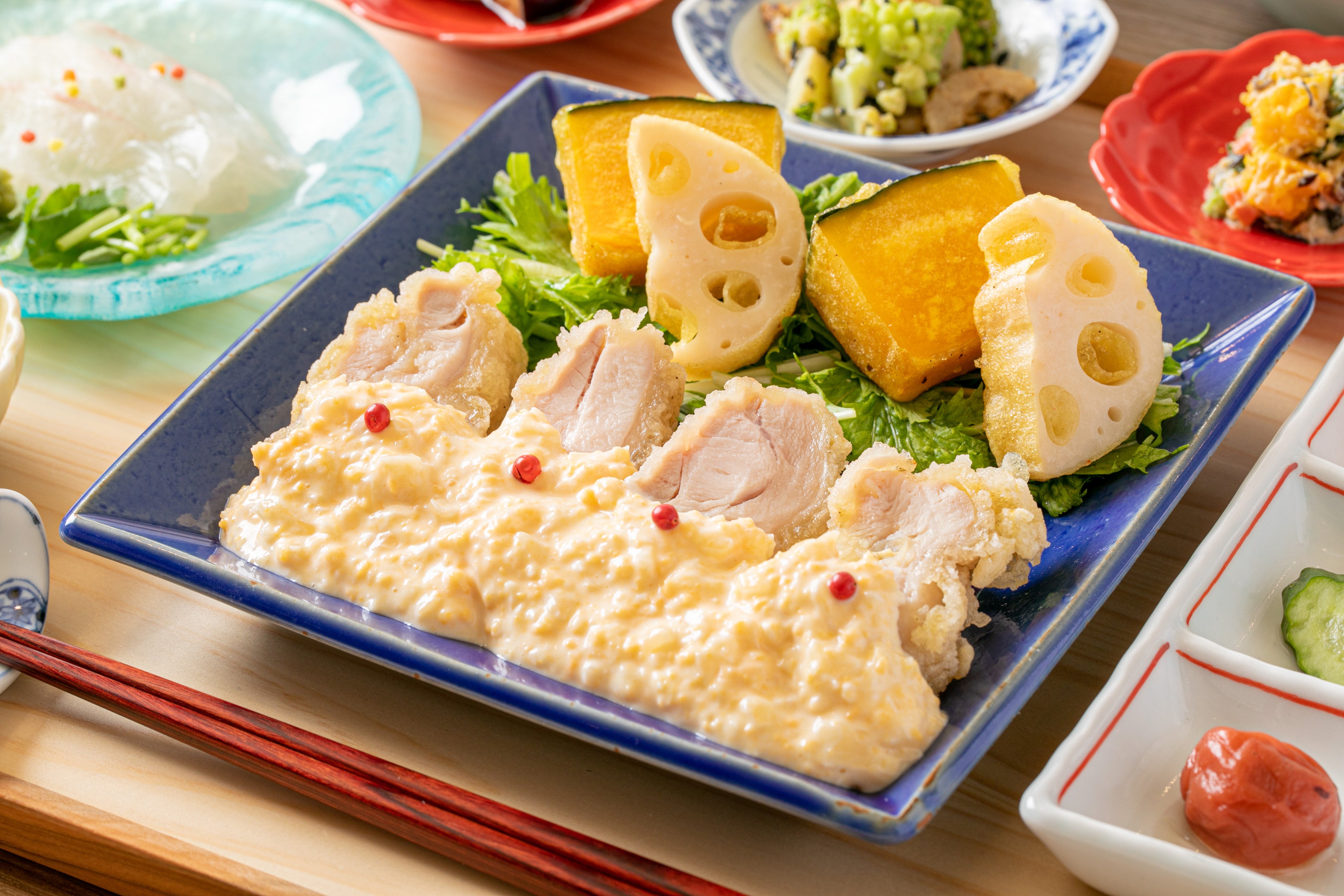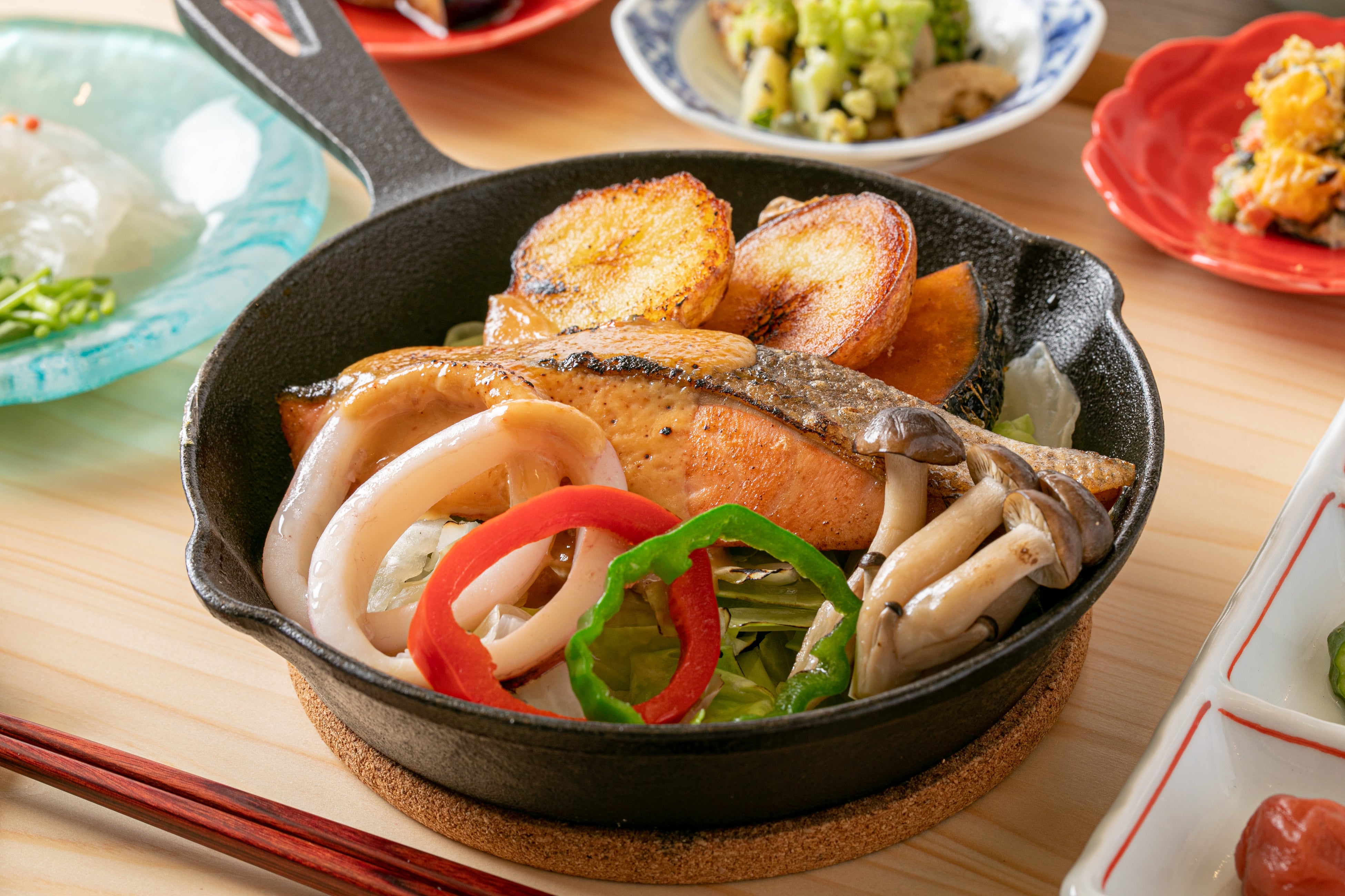 秋メニューでは旬の鮭を使用したムニエルや、しいたけの萩真丈のはさみ揚げなど味覚の秋にふさわしいお料理を丁寧に盛り付けました。
