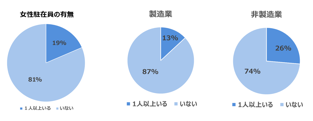 海外子会社で駐在員として赴任する女性が「1人以上いる」と回答した企業は19%。業種別では、製造業の13%、非製造業の26%で女性が駐在員として赴任している。