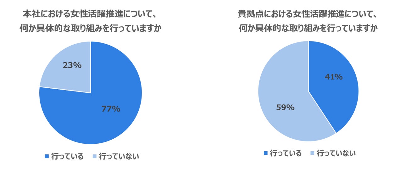 親会社である日本本社における女性活躍推進の取り組みの有無を尋ねたところ、77%が「行っている」と回答したが、女性駐在員の派遣の有無との相関関係は見られなかった。また、海外拠点内でも女性活躍推進の取り組みを行っている企業は41%にとどまった。