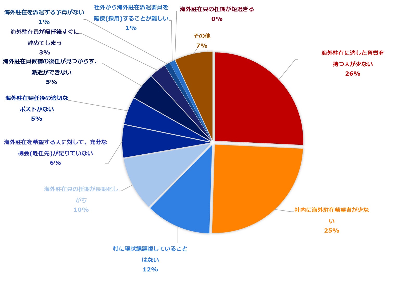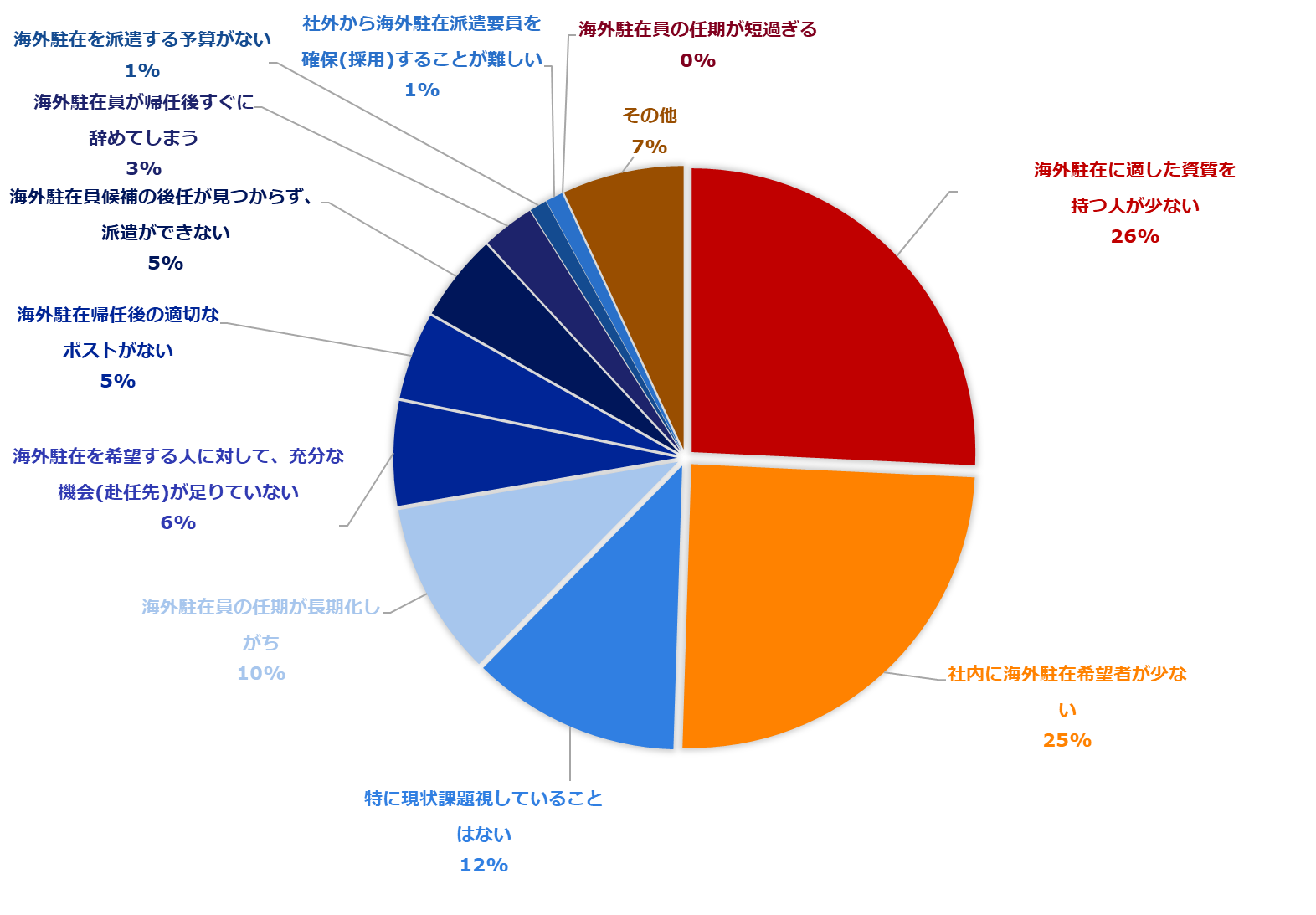 「海外駐在に適した資質を持つ人が少ない(26%)」「社内に海外駐在希望者が少ない(25%)」ことを課題視