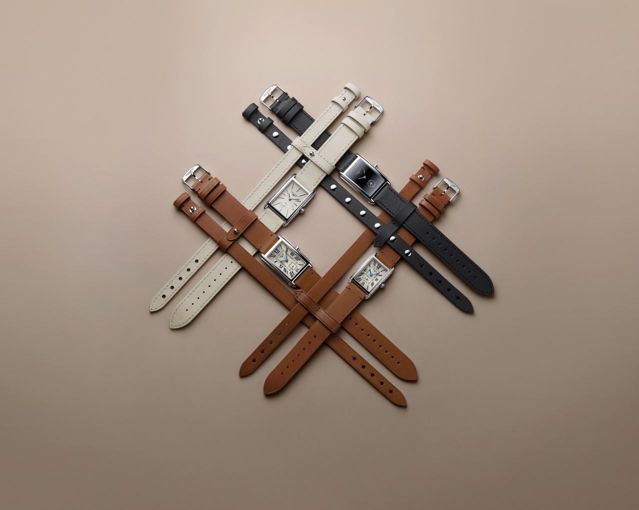クォーツムーブメント、L176.2 (ETA 980.163)、時/分/6時位置にスモールセコンド、レクタンギュラー型、23.30 x 37.00 mm、厚さ7.20mm、ステンレススティールケース、ブラックラッカーポリッシュダイアルまたはシルバー「フリンケ」ダイアルにローマ数字またはベージュオパーリンダイアルにアプライドインデックス、サファイアガラス、3気圧防水 (30メートル)、リベット付きブラックダブルレザーストラップまたはブラウンダブルレザーストラップまたはベージュダブルレザーストラップ、インターチェンジャブルシステム、アクセサリーとしても着用可