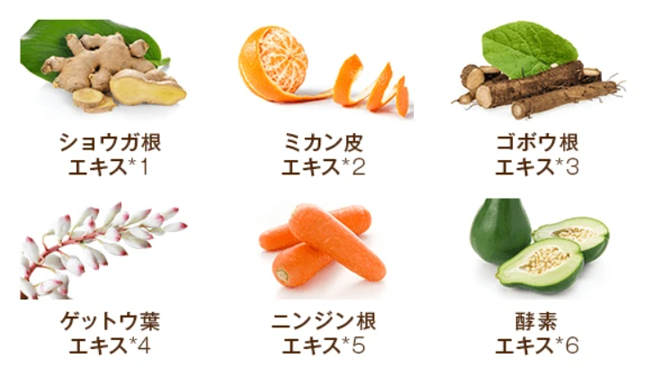●血行促進:ショウガ根エキス*1、ミカン皮エキス*2、 ゴボウ根エキス*3、ニンジン根エキス*5