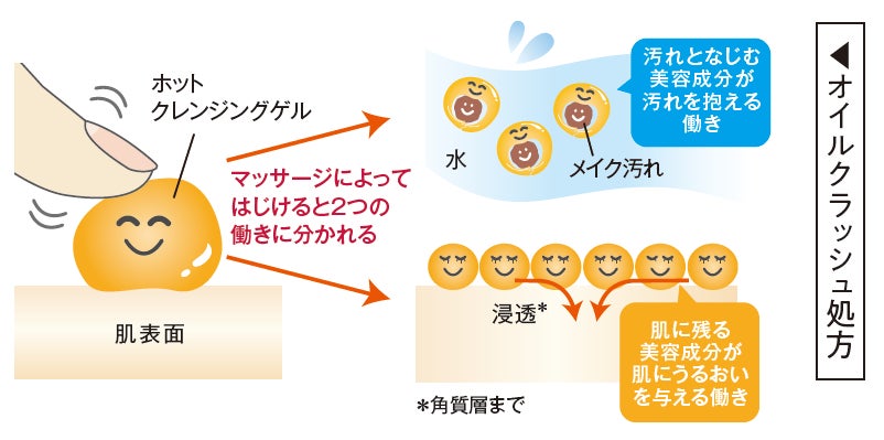 マッサージをすることによって弾ける「オイルクラッシュ処方」を採用。メイクを絡め取る美容成分と肌に残る美容成分にわかれるので、 メイクはしっかりと落ちるのに、肌にうるおいと美容成分が残ります。