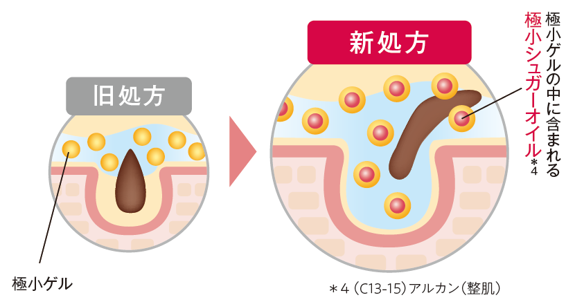 〈ホットクレンジングゲル〉が 2017 年より採用している「極小ゲル」に加え、毛穴の奥まで入り込み毛穴の汚れを取り除く「極小シュガーオイル*7」 を配合。肌を温めながらゆっくりとマッサージすることで 、毛穴の汚れをさらにスッキリとオフします。
