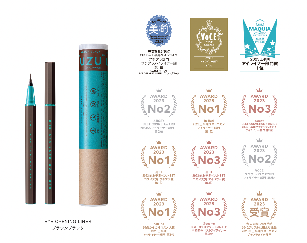 株式会社フローフシ(本社:東京都港区)が展開するブランド「UZU BY FLOWFUSHI」では、2023年3月に発売した『EYE OPENING LINER』 が、メイクアップアーティスト、美容ジャーナリストなどのプロフェッショナルより高い評価を得て、美的・MAQUIA・VOCEなどの美容雑誌やファッション誌など、幅広いメディアにて18*のビューティーアワードを受賞いたしました。また、『EYE OPENING LINER』 に加えて、『アイクリーム 00』や『UZU まつげ美容液』においても、ベストコスメを複数受賞しております。