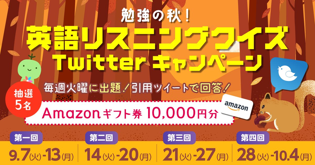 株式会社ポリグロッツ(本社:東京都新宿区、代表取締役:山口隼也)は、9月7日(火)~10月4日(月) まで英語リスニングクイズTwitterキャンペーンを開催いたします。クイズにご正解した方の中から抽選で、 Amazonギフト券1万円分を合計20名の方にプレゼントいたします。