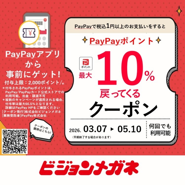 眼鏡専門店を運営する株式会社ビジョンメガネ(大阪市)は、スマートフォン決済サービス「PayPay」の利用で、最大10%のPayPayポイントを付与するキャンペーンをビジョンメガネとeyevory by ビジョンメガネの対象98店舗にて開催いたします。