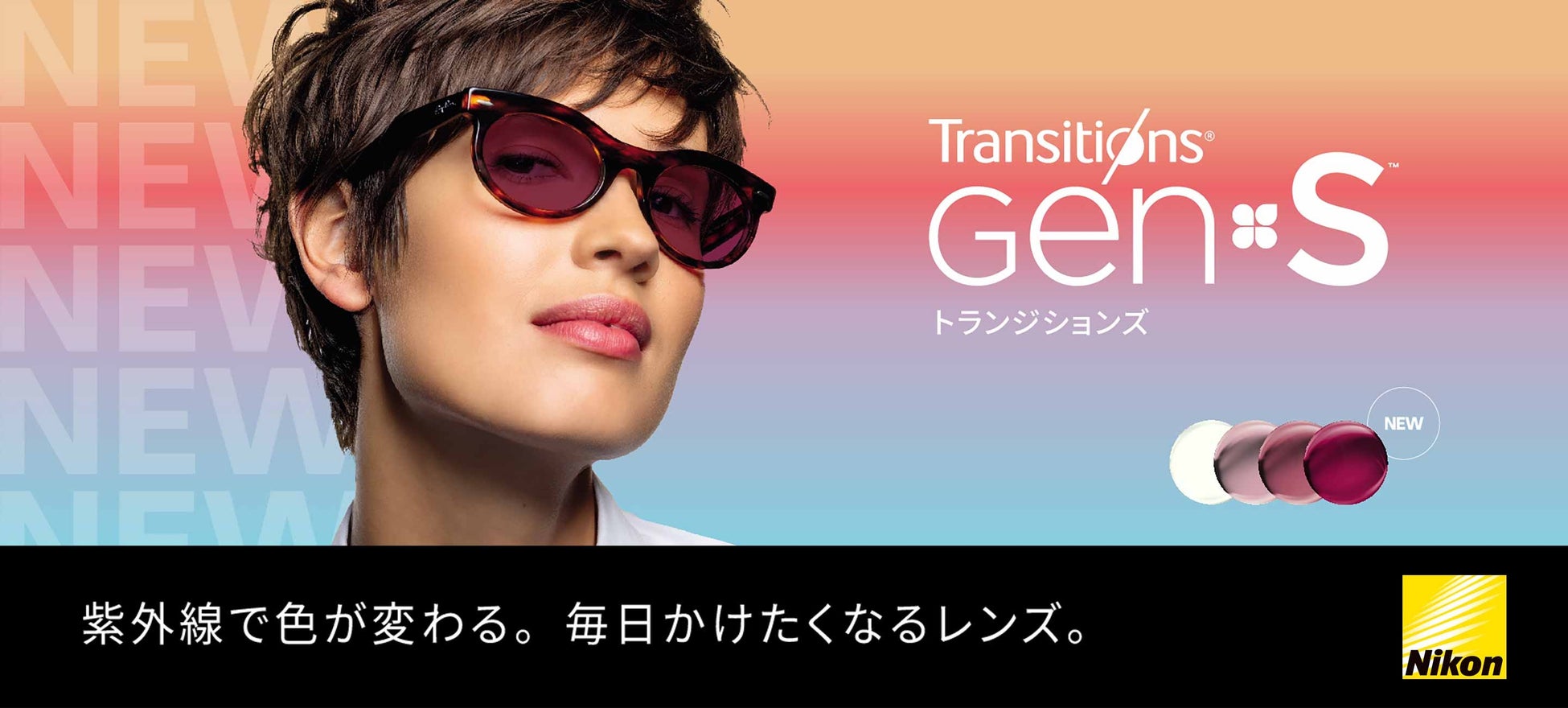 レジャーやアウトドアなど、アクティブライフを楽しみたい方には、調光レンズ「Nikon Transitions®(トランジションズ)」がおすすめです。紫外線量に応じてレンズの色が自動的に変化するため、室内ではクリアな眼鏡として、屋外ではまぶしさを軽減するサングラスとして、掛け替えの手間なく、一本で二役をこなします。